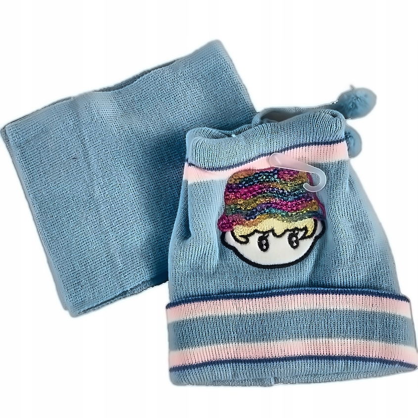 Praktyczny i estetyczny zestaw zimowy dla chłopców, który zawiera czapkę oraz pasujący szalik o wymiarach 100x15 cm. Komplet w pięknym niebieskim kolorze ozdobiony motywem chłopca. Idealny na chłodne dni, zapakowany w woreczek