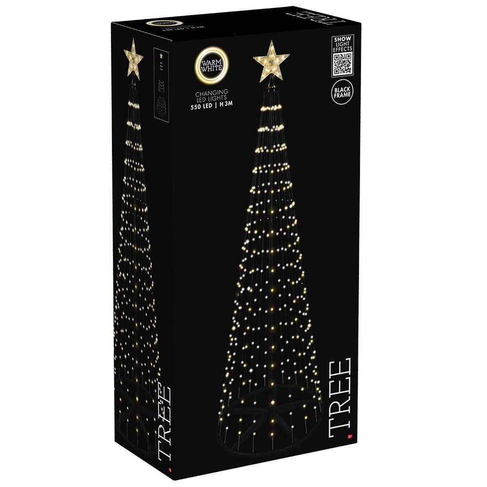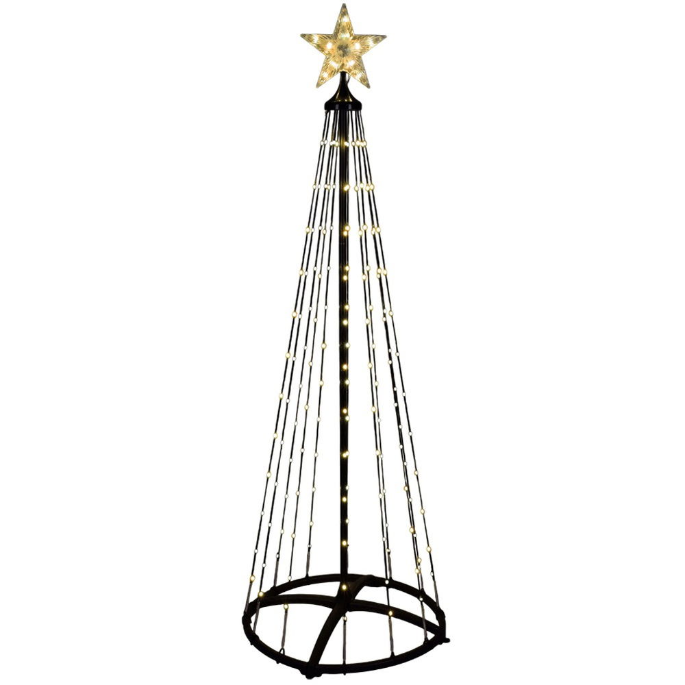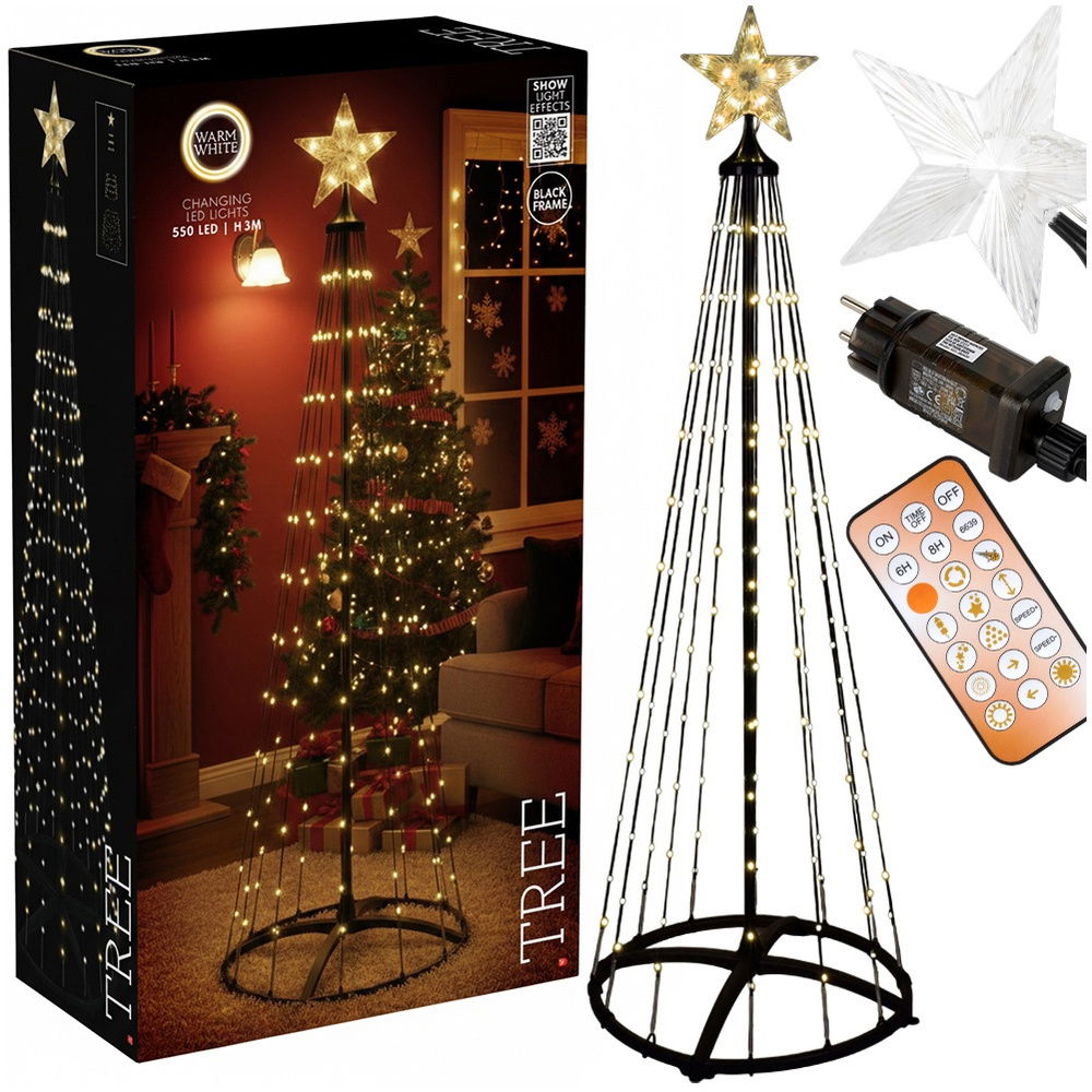 Świecąca choinka LED z gwiazdą - Imponująca, nowoczesna dekoracja świąteczna w formie stożka o wysokości aż 3 m i średnicy podstawy 90 cm. Składa się z 20 sznurów świetlnych zwieńczonych podświetlaną gwiazdą, a całość rozświetla łącznie 550 cyfrowych diod LED o ciepłej, białej barwie. Idealna do stworzenia spektakularnej iluminacji w ogrodzie lub przestrzeni publicznej.