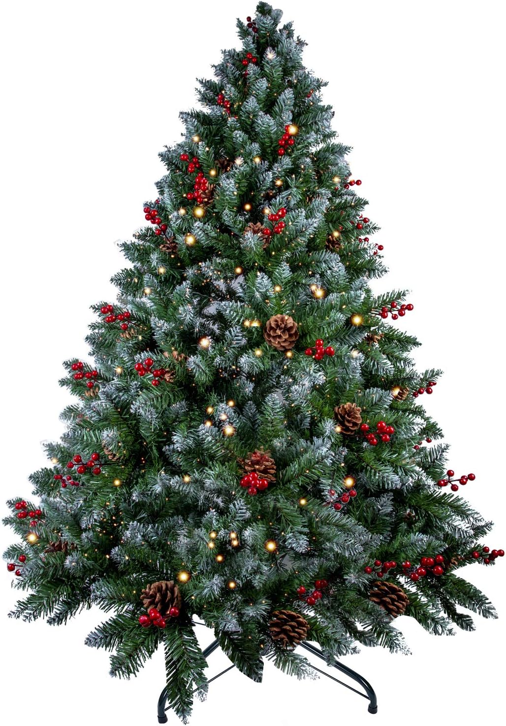 Himaly sztuczna choinka na zawiasach do dekoracji świątecznych z flokowanymi śniegiem końcówkami, szyszkami sosnowymi, czerwonymi owocami, lampami z drutu miedzianego 1,2 M/240 lamp