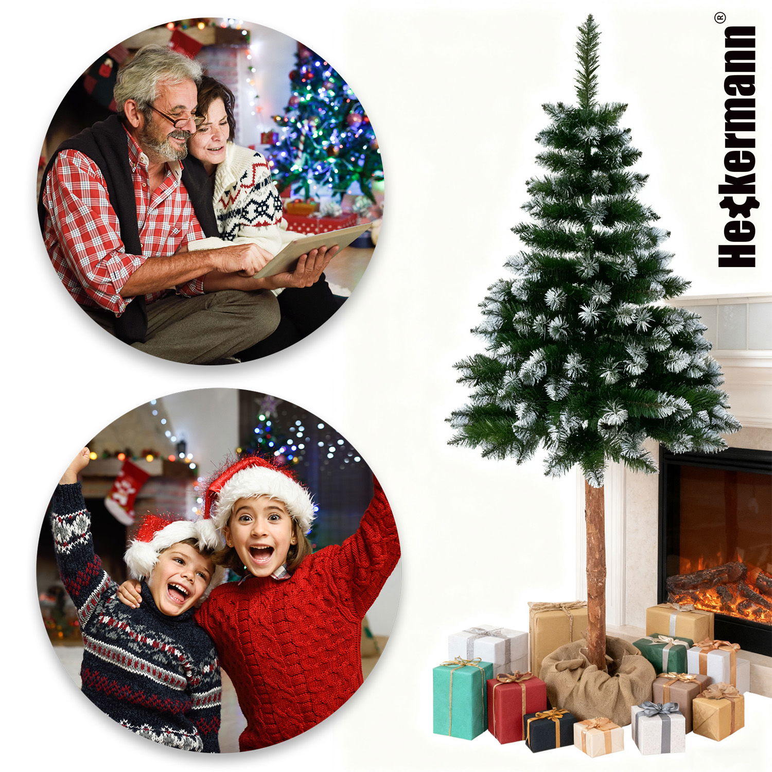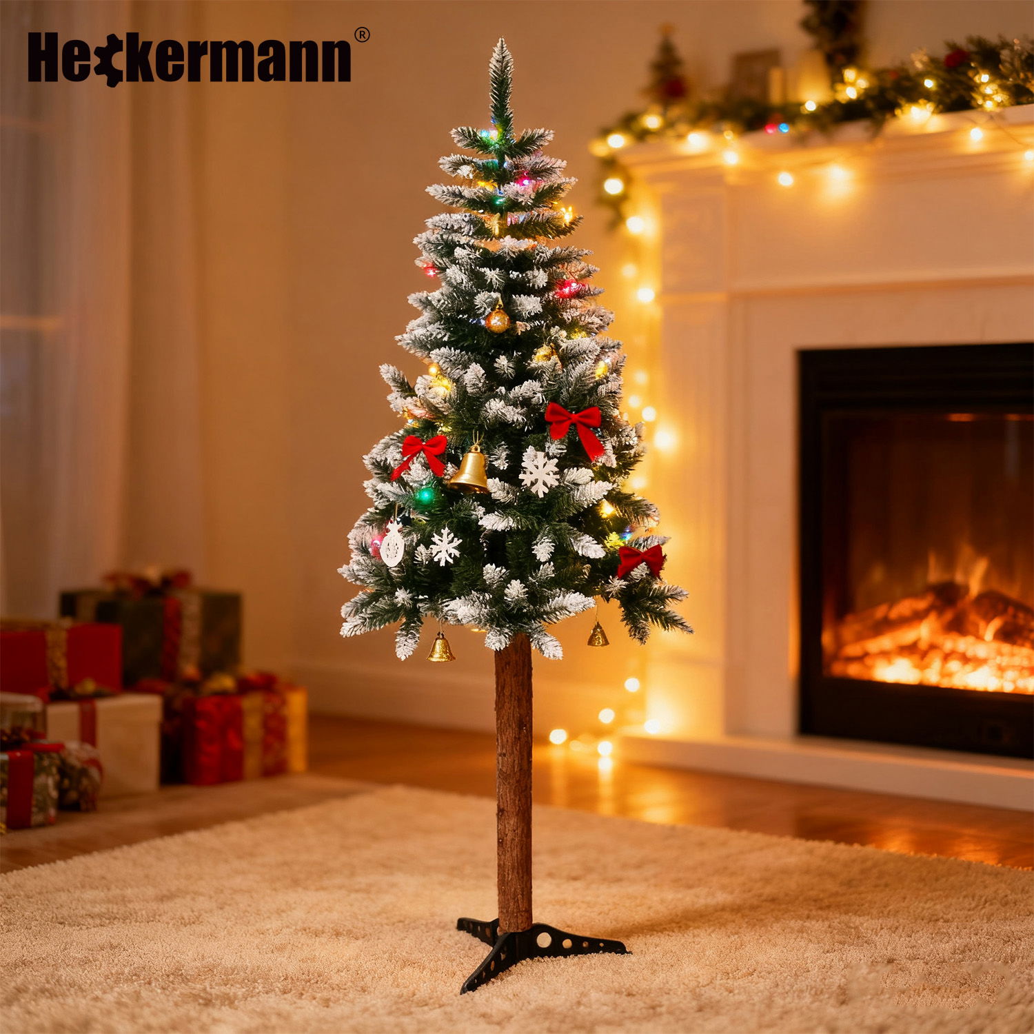 Choinka Heckermann ma gęste, starannie rozłożone gałązki pokryte delikatnym efektem śniegu. To nie tylko dekoracja – to klimat zimowego poranka, zamknięty w Twoim domu.
