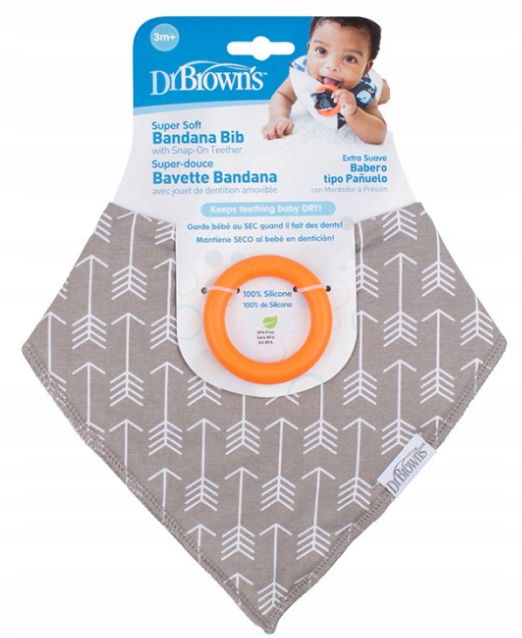 Zapewnia dziecku suchość i wygodę podczas ząbkowania oraz przynosi ulgę obolałym dziąsłom. Bawełniana, podszyta polarem chustka sprawi, że dziecko zawsze pozostanie suche i stylowe. Posiada regulowane guziki zatrzaskowe, które zapewniają idealne dopasowanie do szyi dziecka. Wszyte w chustkę zatrzaski umożliwiają zamontowanie w niej dołączonego do zestawu silikonowego gryzaka bądź innej ulubionej zabawki lub dowolnego smoczka uspokajającego.