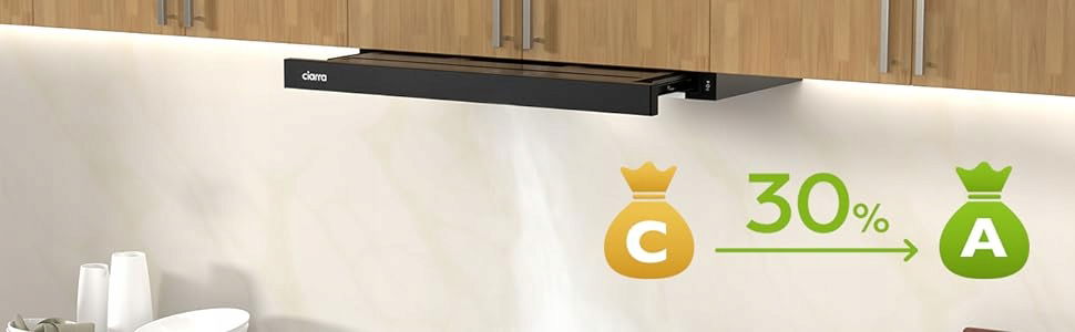 Okapy kuchenne CIARRA charakteryzują się zarówno większą mocą ssania, jak i niższym zużyciem energii.