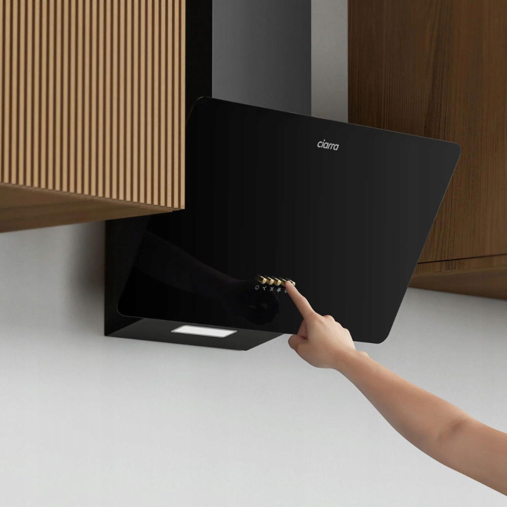 Model CBCB6750-B od Ciarra to elegancki, kątowy okap kuchenny, idealny do nowoczesnych wnętrz. Dzięki swojej unikalnej konstrukcji, jest to urządzenie, które nie tylko efektywnie oczyszcza powietrze w kuchni, ale także stanowi wyrafinowany element dekoracyjny. Montaż na ścianie i czarne wykończenie w połączeniu ze szkłem sprawiają, że okap doskonale komponuje się z różnymi stylami kuchennymi, oferując zarówno funkcjonalność, jak i estetykę.
