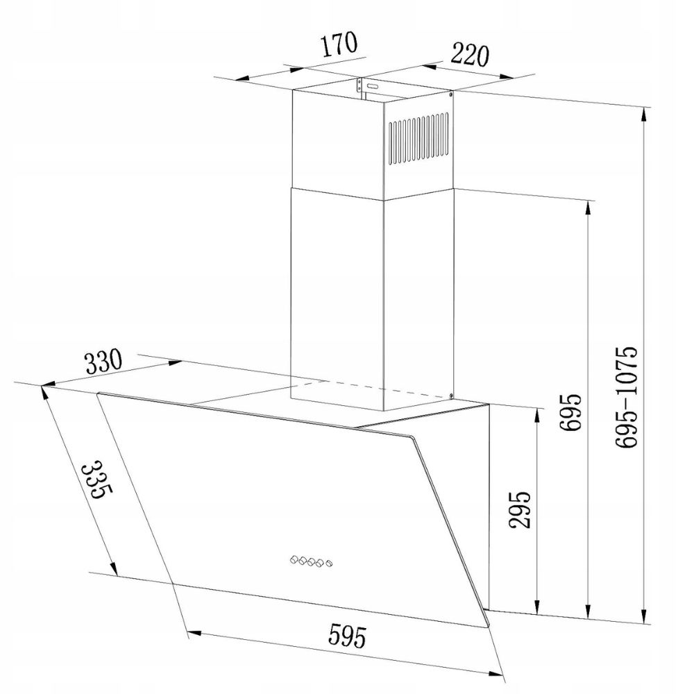 Okap został wykonany z wysokiej jakości materiałów – czarnej malowanej stali oraz szkła, które zapewniają nie tylko trwałość, ale także nowoczesny wygląd. Konstrukcja kątowa umożliwia montaż urządzenia na ścianie, co oszczędza miejsce i nadaje kuchni nowoczesny charakter. Regulowana wysokość (od 695 mm do 1075 mm) pozwala na idealne dopasowanie okapu do przestrzeni kuchennej.