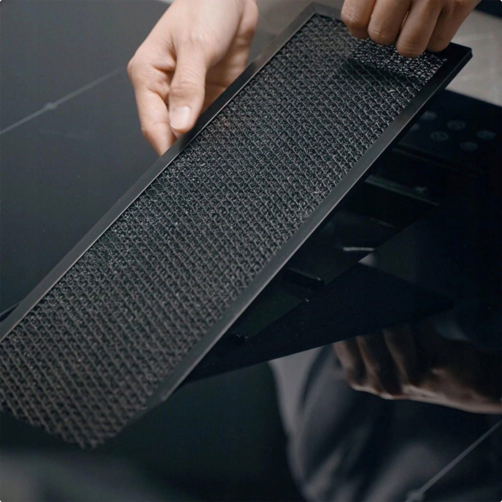 Płyta wyposażona jest w inteligentny system ekstrakcji powietrza, który automatycznie dostosowuje swoją pracę do intensywności gotowania. Przy mocy do 3200 W i przepływie powietrza do 350 m³/h, urządzenie skutecznie usuwa zapachy, dym i opary, zapewniając komfortową atmosferę podczas gotowania.