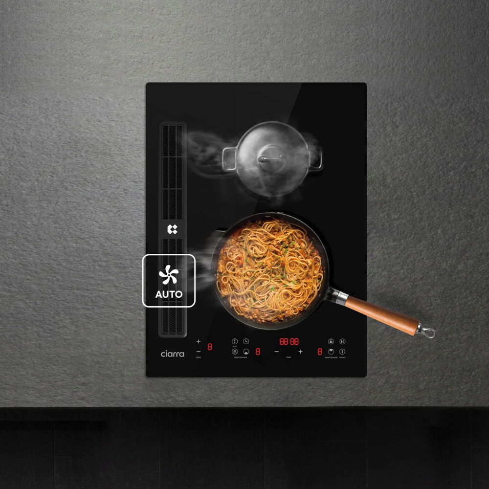 Płyta indukcyjna Ciarra ONE o szerokości 39 cm to idealne rozwiązanie do mniejszych kuchni, gdzie liczy się każdy centymetr przestrzeni. Zintegrowany ekstraktor powietrza zapewnia skuteczne usuwanie dymu i zapachów podczas gotowania, co pozwala cieszyć się świeżym powietrzem nawet w najbardziej intensywnych momentach pracy w kuchni.