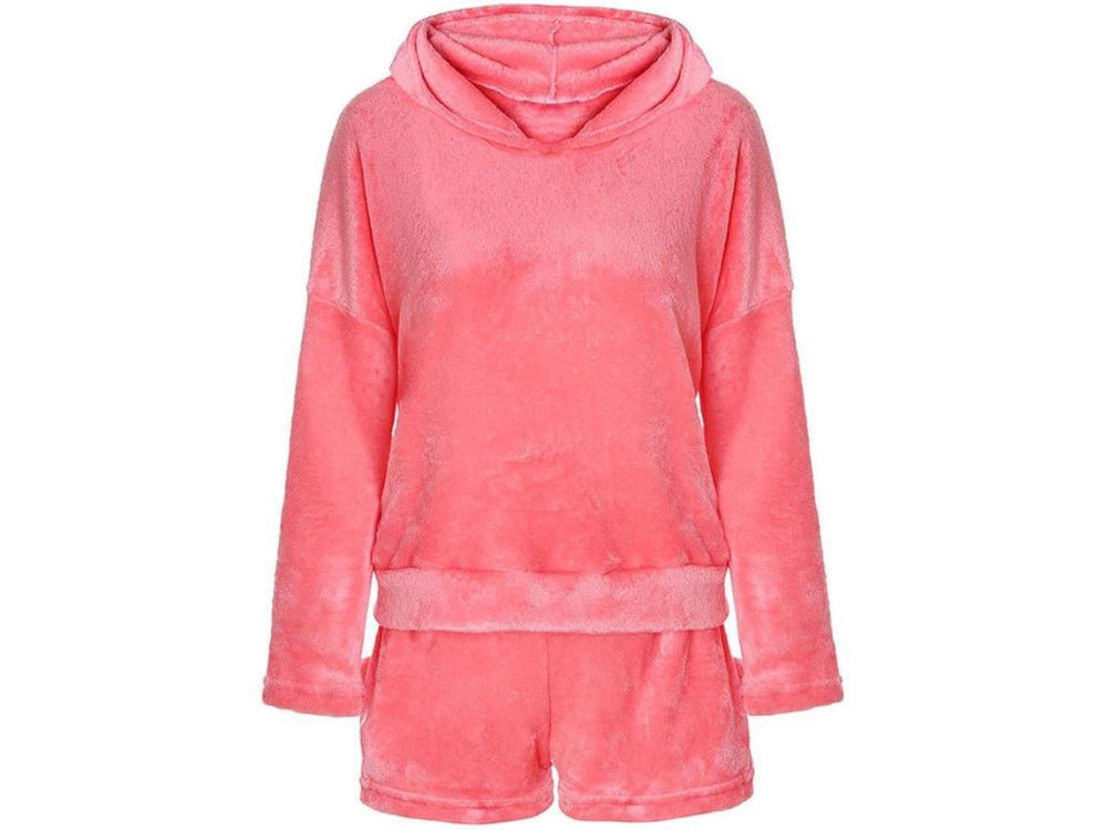 CIEPŁA PIŻAMA DAMSKA DWUCZĘŚCIOWA Z KAPTUREM MIĘKKA PLUSZOWA KRÓTKIE L