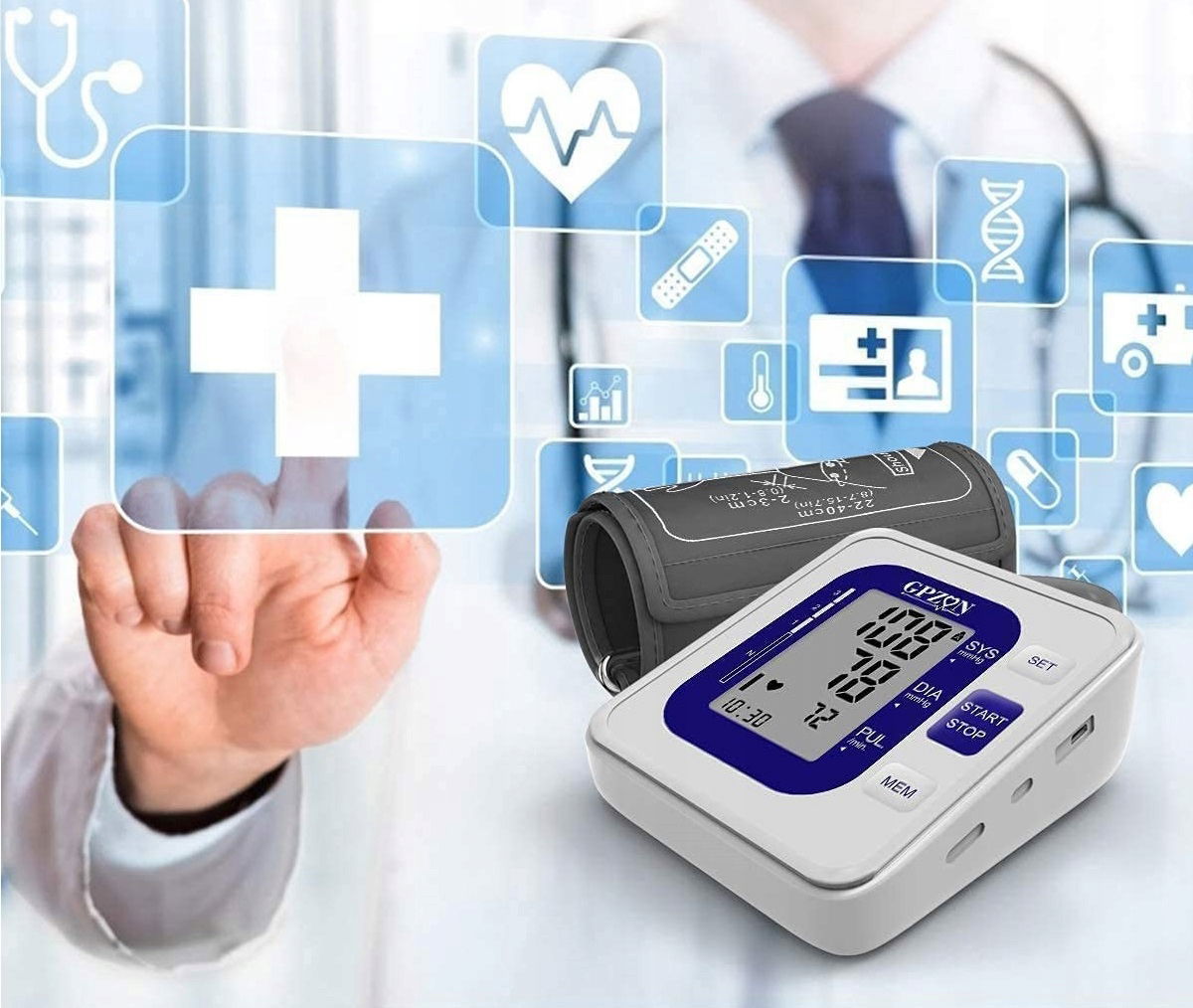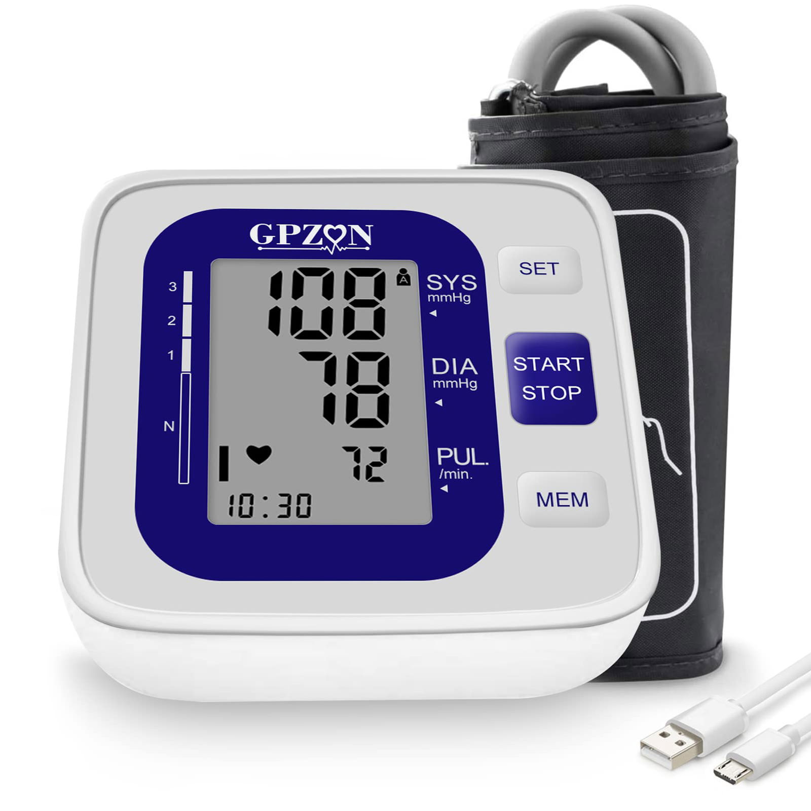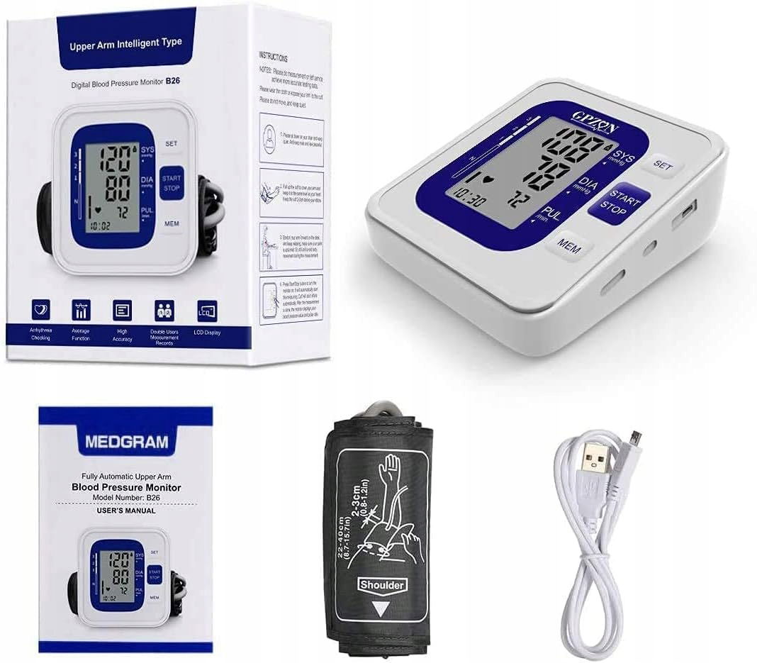 Gpzon B26 Ciśnieniomierz naramienny z mankietem BP, precyzyjny automatyczny zestaw do pomiaru ciśnienia krwi, biało-niebieski, z mankietem o szerokości 22-40 cm