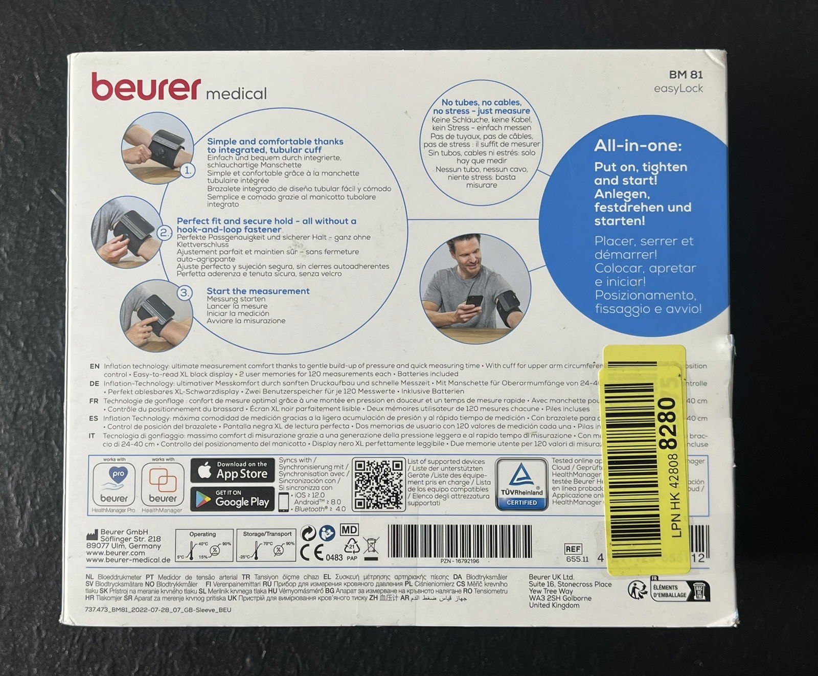 Wyrazisty i przejrzysty ekran z odpowiednio dobraną wielkością cyfr sprawiają, że jest on przeznaczony zarówno dla osób młodszych jak i starszych. Czujnik od nieregularnego bicia serca oraz arytmii, a każdy pomiar wykonywany jest w sposób automatyczny i niezwykle precyzyjny. Każdy z dokonanych pomiarów ciśnienia jakie mierzy ciśnieniomierz naramienny Beurer BM 81 można przesyłać do wybranego nośnika elektronicznego przy pomocy Bluetooth.