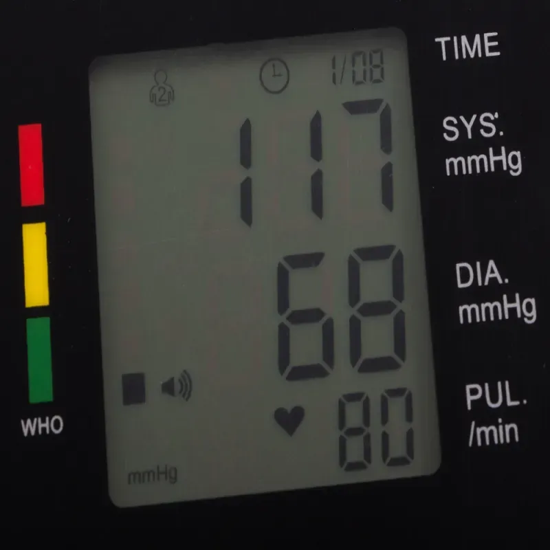 Urządzenie posiada duży funkcjonalny wyświetlacz LCD. Po zakończeniu pomiaru na ekranie równocześnie wyświetlona zostanie wartość ciśnienia skurczowego, rozkurczowego oraz częstotliwość tętna. Ciśnieniomierz posiada antypoślizgową podstawę.