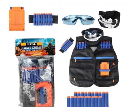 Wysokiej jakości zestaw wyposażenia sił specjalnych. Zawiera kamizelkę antyterrorysty z pasem na naboje (20 sztuk piankowych naboi), okulary taktyczne, komin z kościotrupem oraz magazynek.