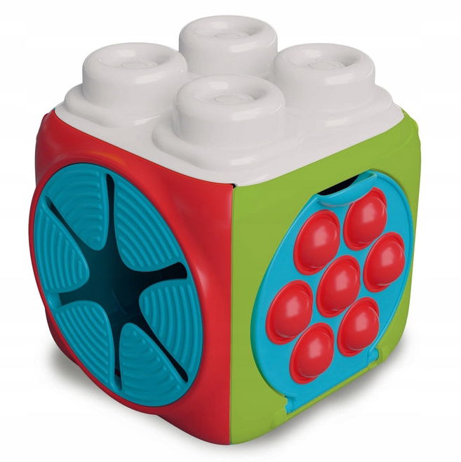 Kostka pełna wypukłych, ciekawych tekstur i funkcji pobudzających sprawność manualną dziecka oraz 4 miękkie klocki do zabawy.