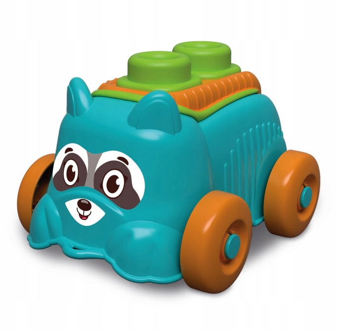 Wesoły pojemnik do przenoszenia klocków, pokrywka ma wstawki z tego samego materiału, co miękkie klocki i można na nich ustawiać kostki. Wypukłe tekstury pobudzają rozwój sensoryczny dziecka i usprawniają zręczność manualną.