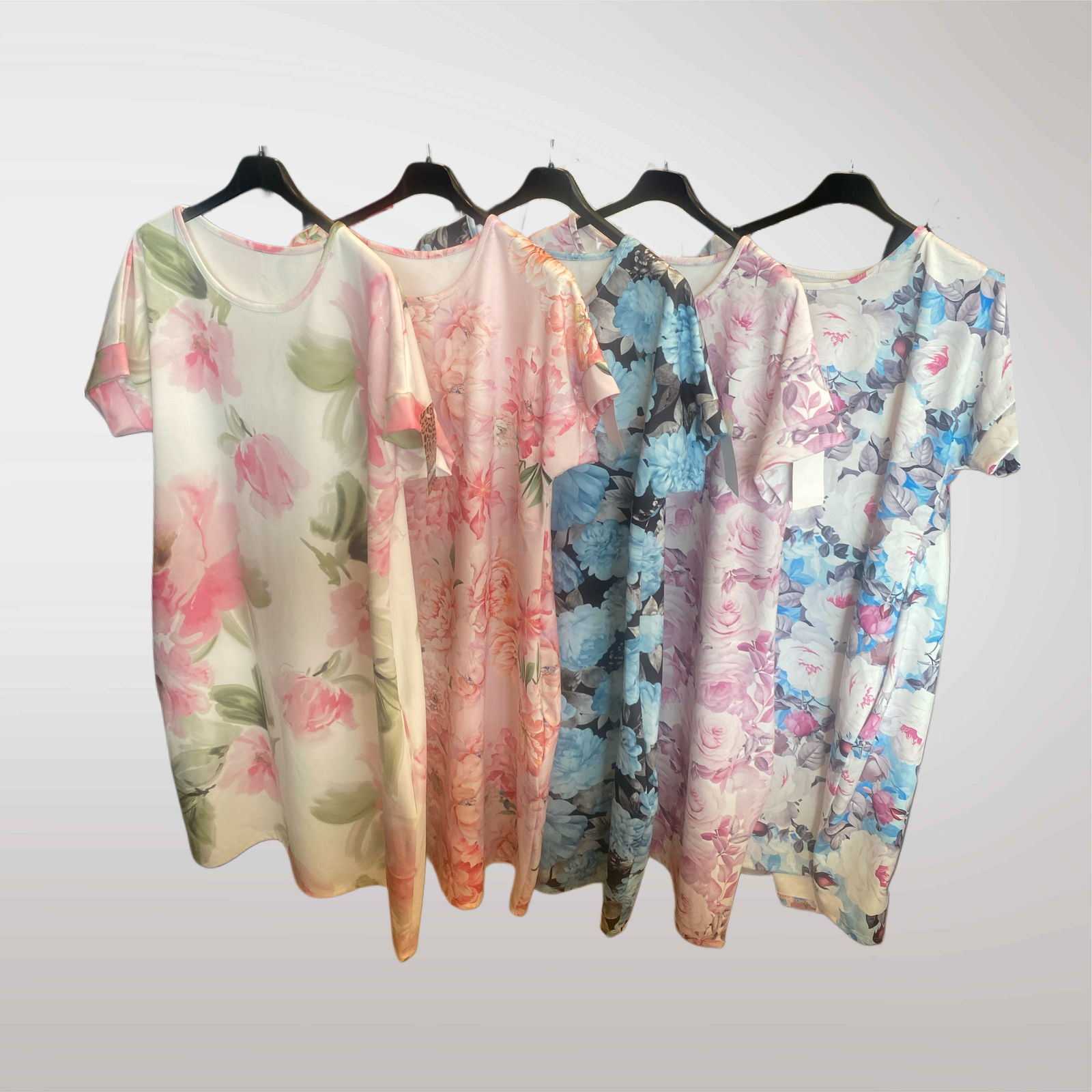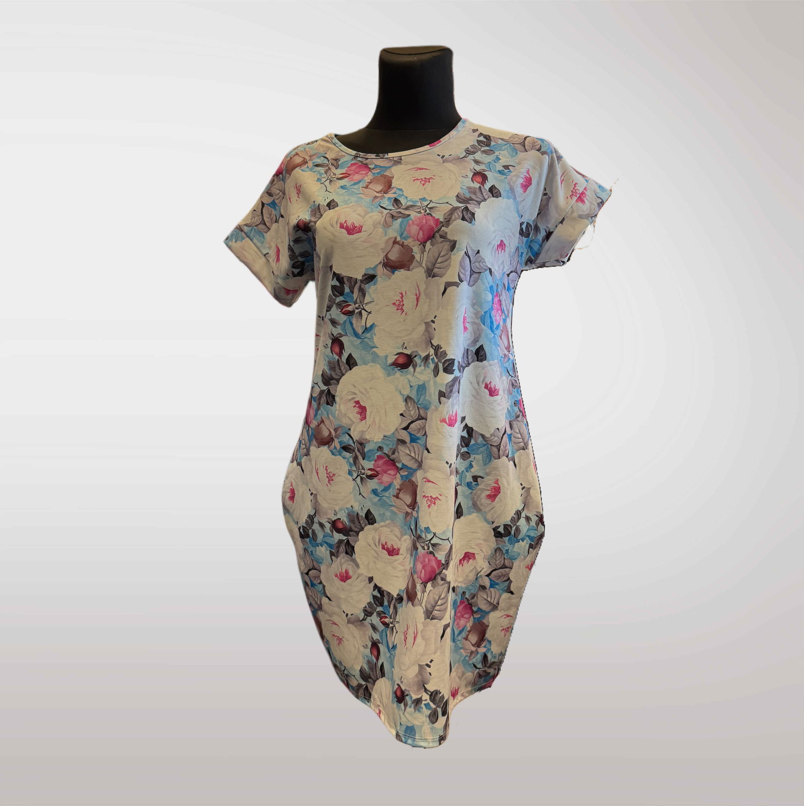 Luźna sukienka z krótkim rękawem i kieszeniami po bokach. Wzór w kwiaty dodaje kobiecego uroku, a prosty fason zapewnia wygodę na co dzień. Rękawy wykończone mankietem, a miękki materiał dobrze układa się na sylwetce.