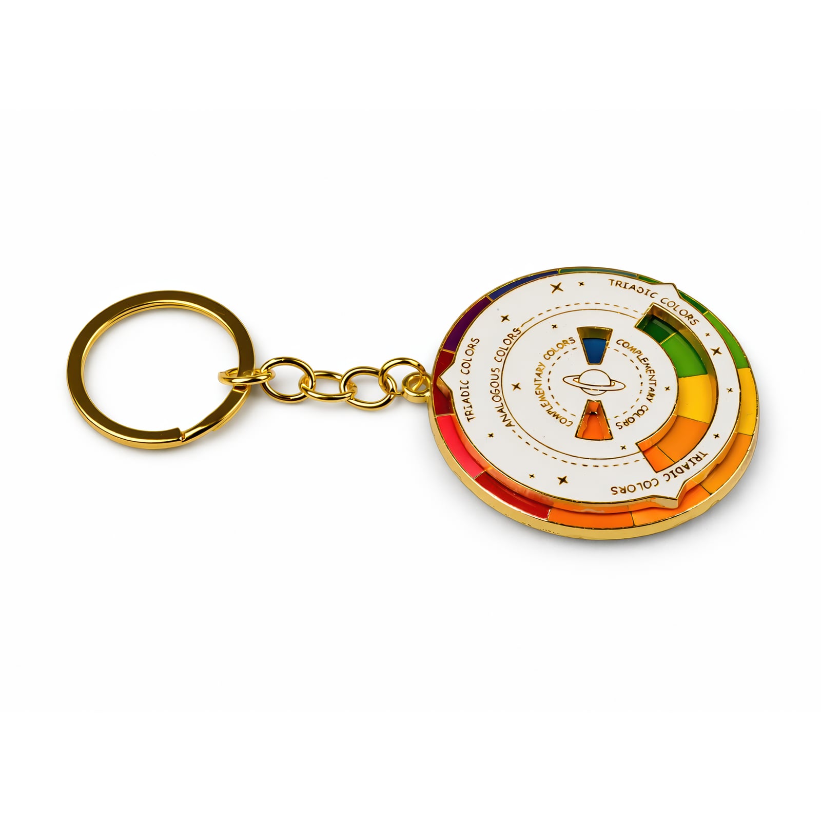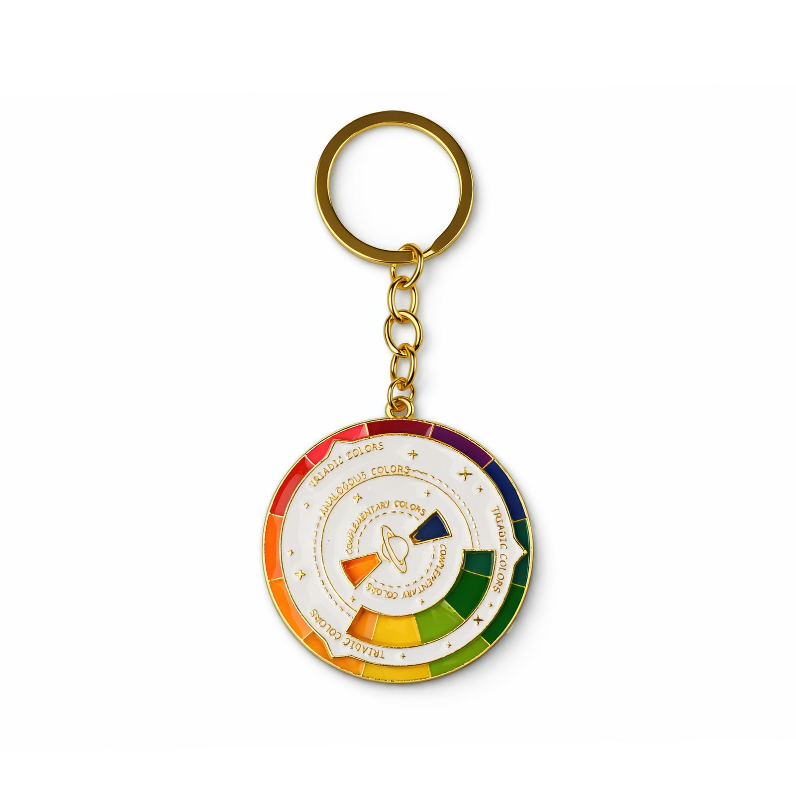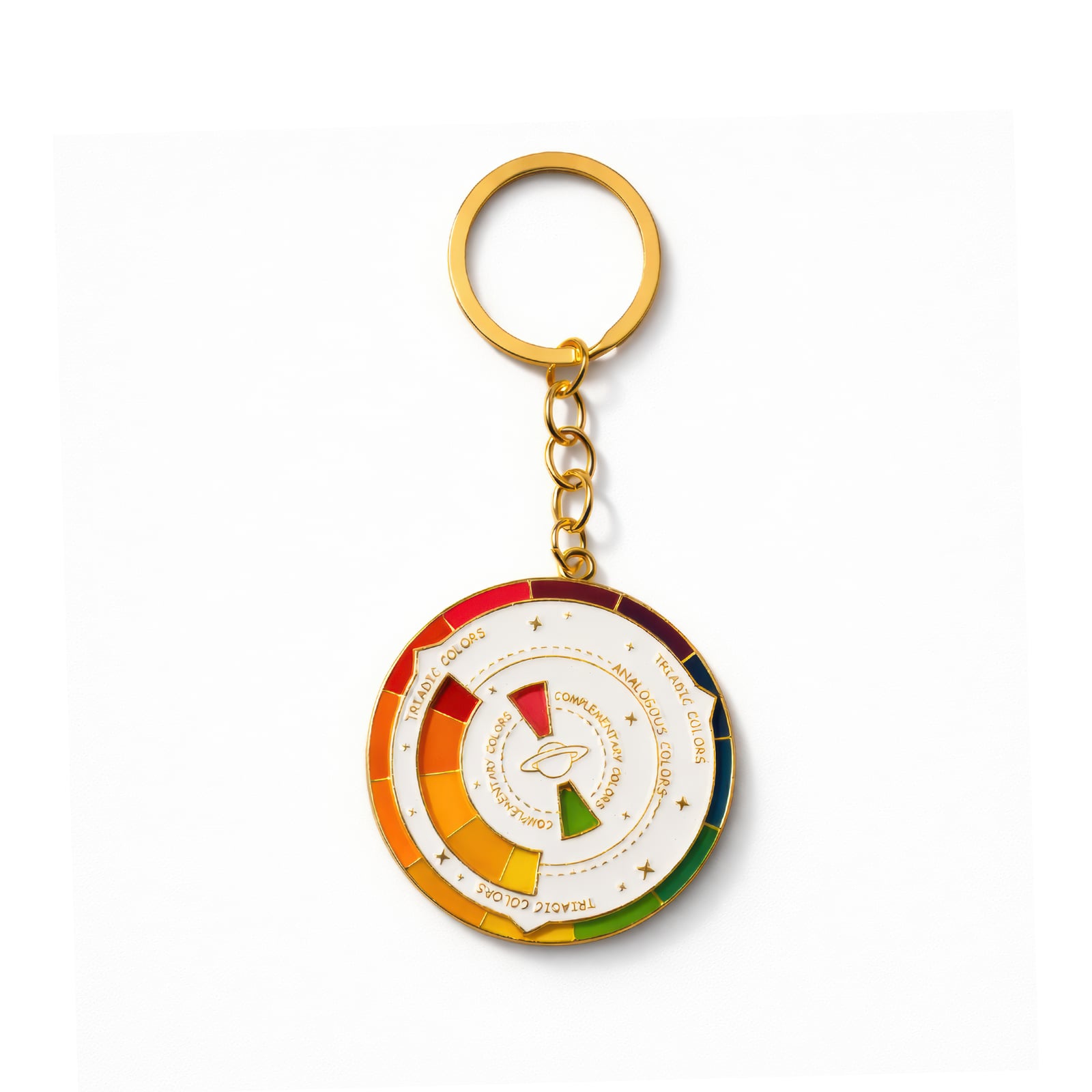 Poznaj teorię kolorów w mgnieniu oka dzięki temu metalowemu kółku kolorów o średnicy 5 cm, które możesz przyczepić do kluczy. Okrągła zawieszka prezentuje pełne spektrum – czerwienie, pomarańcze, żółcie, zielenie, błękity i fiolety – ułożone w segmenty barw podstawowych, drugorzędnych i trzeciorzędnych. Etykiety wskazują relacje triadyczne, analogiczne i komplementarne, zamieniając każdy breloczek w szybkie źródło informacji dla projektantów, artystów i miłośników kolorów. Wykonane z mosiądzu lub pozłacanego metalu, kółko o gładkiej, lekko błyszczącej powierzchni kontrastuje z delikatnie teksturowanym tyłem i subtelnym złotym łańcuszkiem połączonym z wytrzymałym kółkiem do kluczy. Niezależnie od tego, czy szkicujesz palety barw, czy po prostu cieszysz się odrobiną koloru, to miniaturowe kółko doda zabawnego, edukacyjnego akcentu do każdego zestawu kluczy.