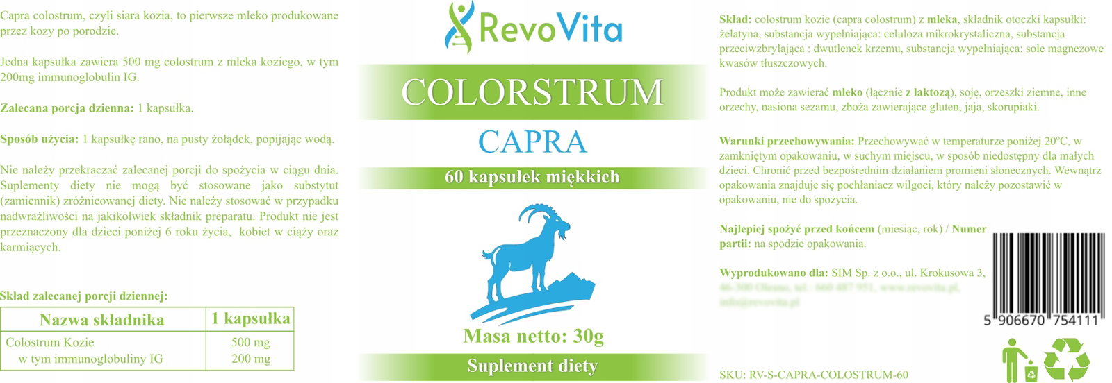 Jedna kapsułka zawiera 500 mg colostrum z mleka koziego, w tym 200mg immunoglobulin IG (40%).