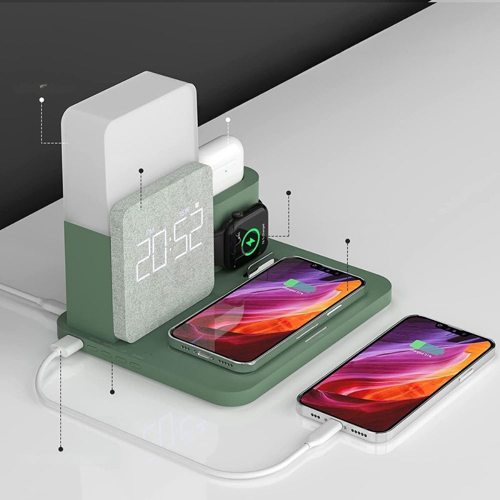Stacja ładowania COLSUR łączy w sobie ładowarkę indukcyjną Qi, budzik z funkcją drzemki i lampkę nocną z regulacją jasności. Wszystko to w eleganckiej, zielonej obudowie, która świetnie prezentuje się na biurku czy szafce nocnej. Zasilaj jednocześnie iPhone’a, zegarek i słuchawki AirPods – bez zbędnych kabli.