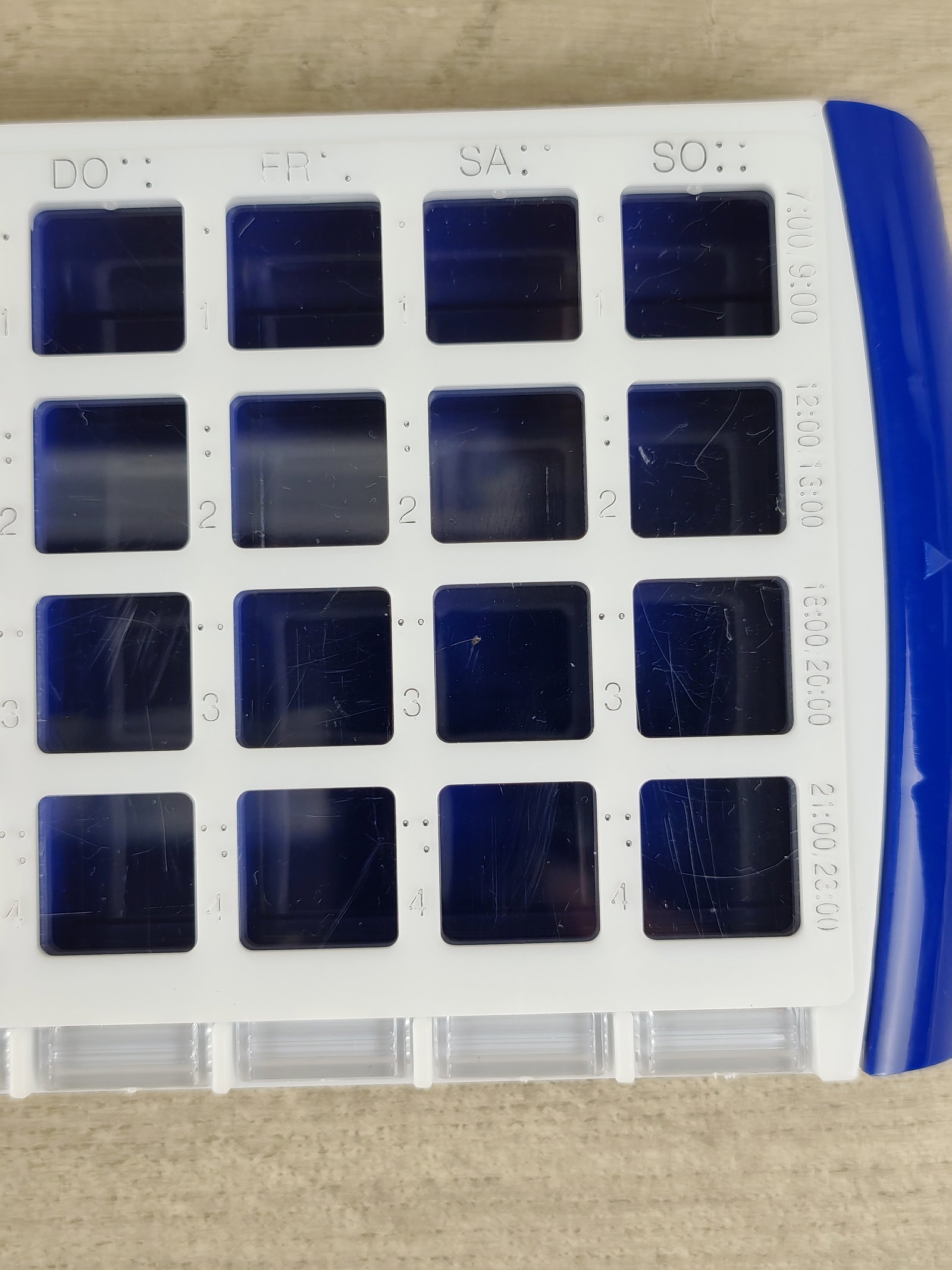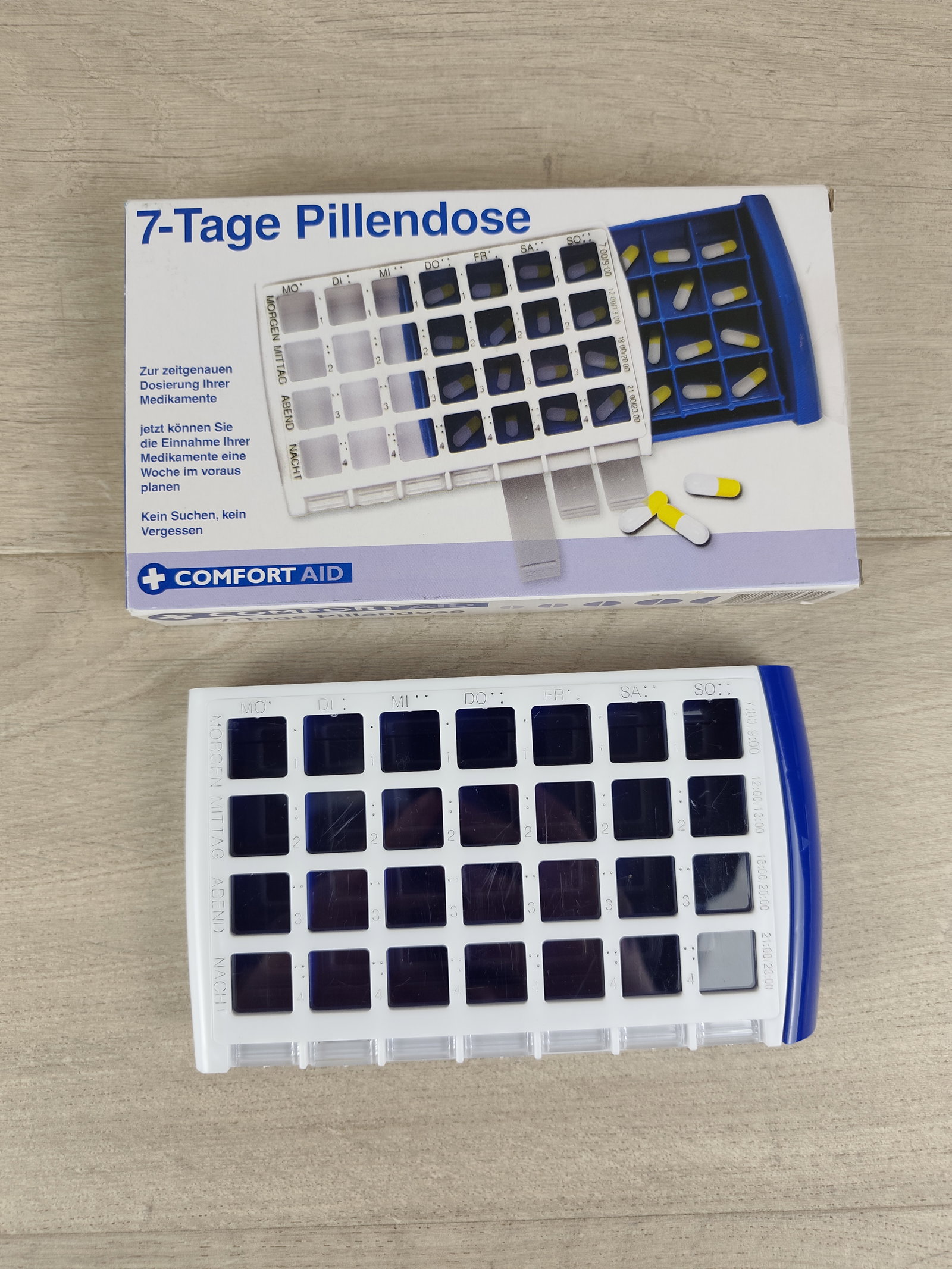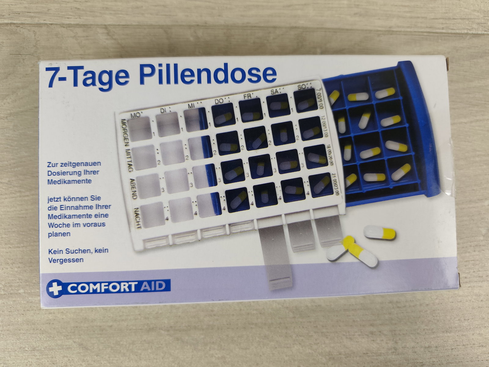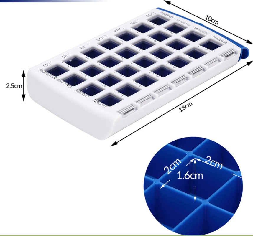 💊 COMFORT AID – 7‑dniowy organizer leków z 4 komorami na każdy dzień to praktyczne i czytelne rozwiązanie, które pomaga uporządkować przyjmowanie leków i suplementów na cały tydzień. Dzięki wyraźnym oznaczeniom dni tygodnia oraz podziałowi na rano, południe, wieczór i noc, łatwo zaplanujesz dawkowanie i unikniesz pomyłek.