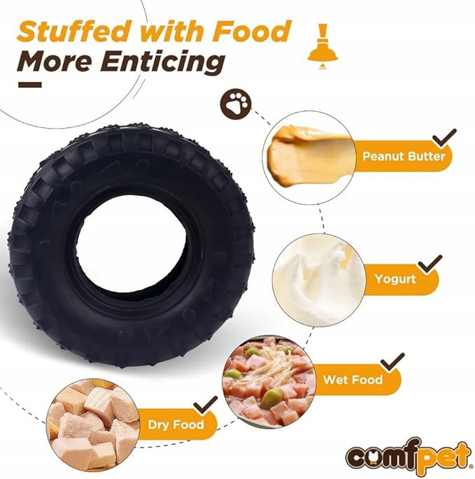 - Jedyny w swoim rodzaju kształt opony – zabawka do żucia dla psa ma kształt obręczy, a każda część jest starannie zaprojektowana dla Twojego psa. Podwyższona powierzchnia masuje dziąsła psa, czyści zęby i zmniejsza choroby jamy ustnej. Wewnętrzna strona obręczy może być posmarowana ulubionymi przekąskami Twojego psa, np. z masłem orzechowym lub wilgotnymi smakołykami.