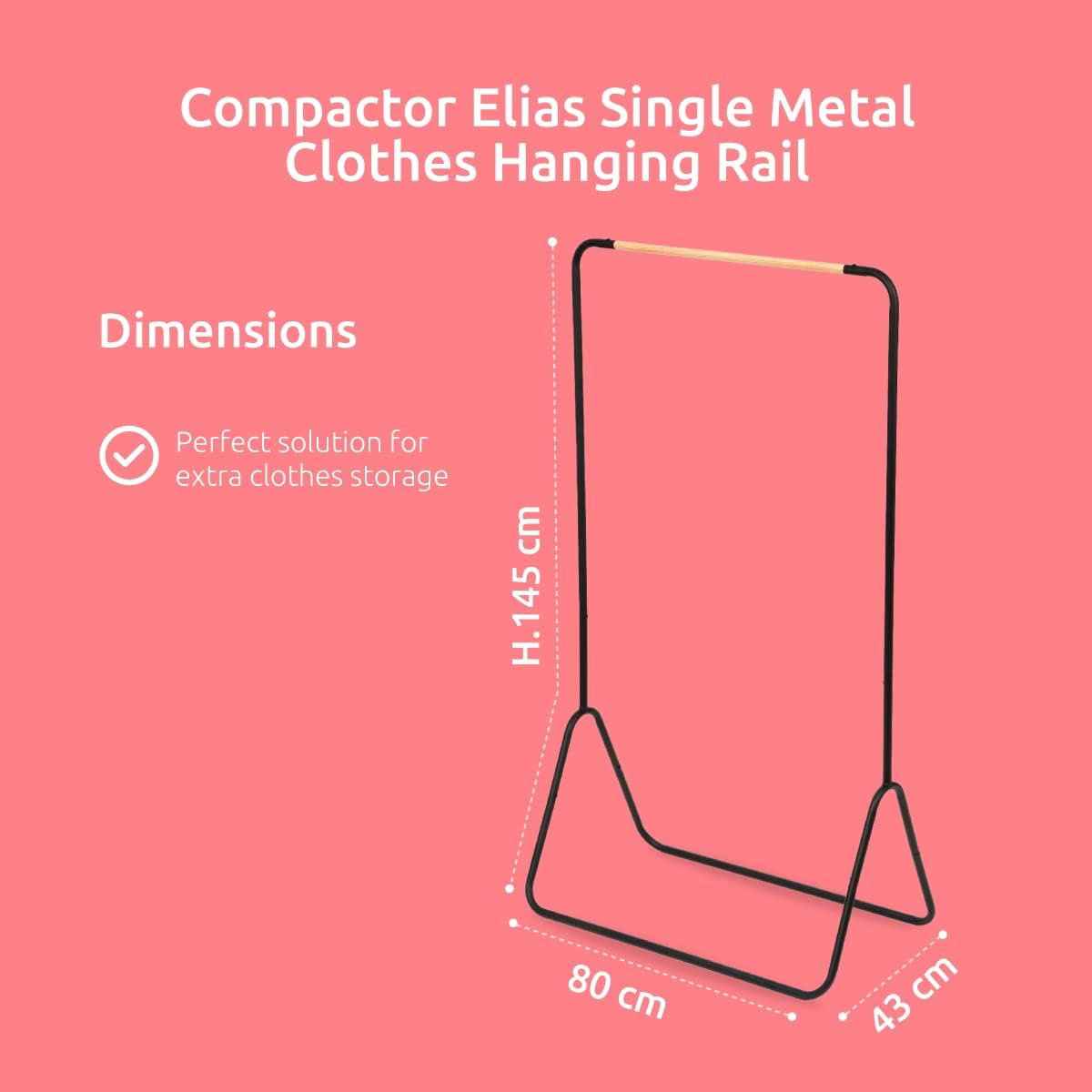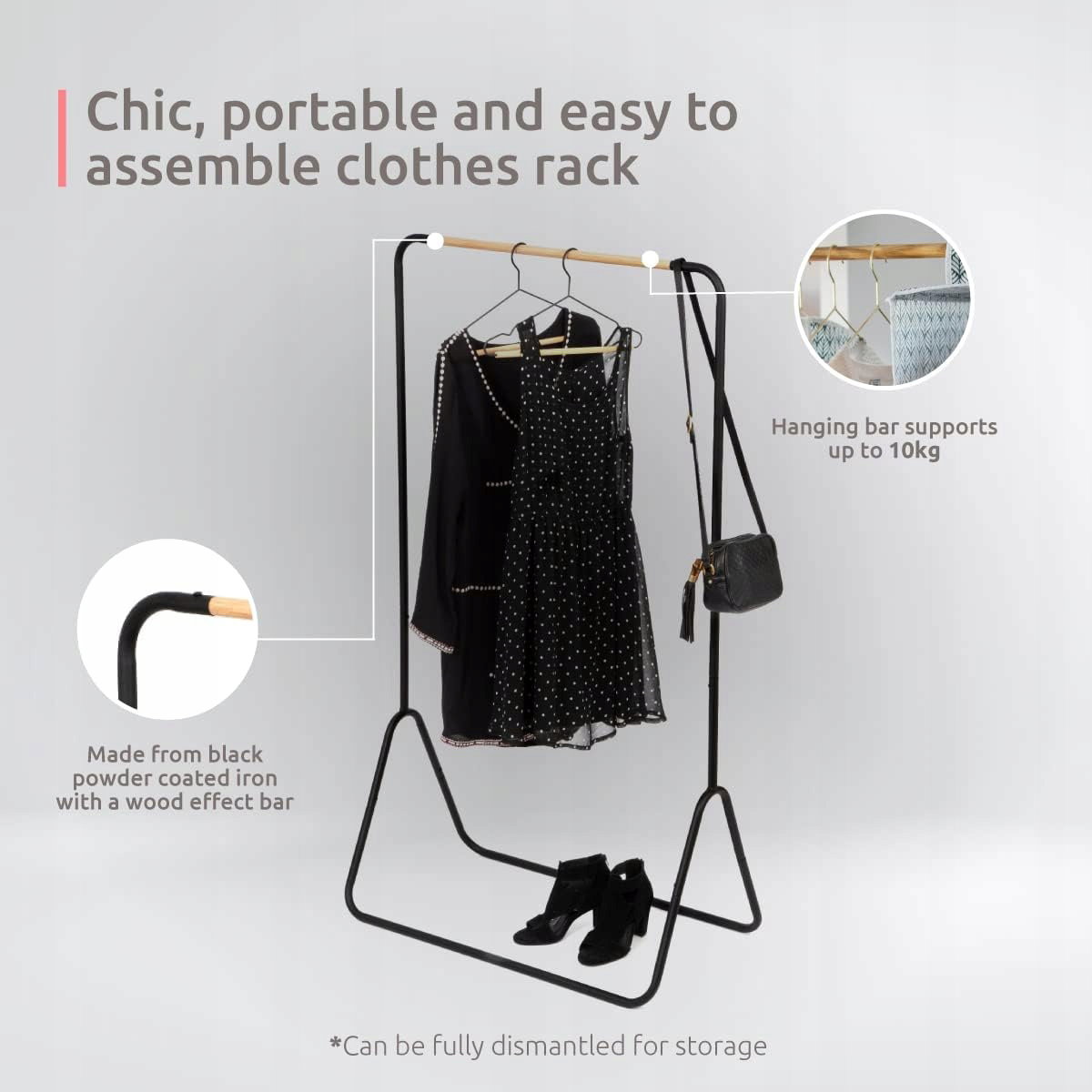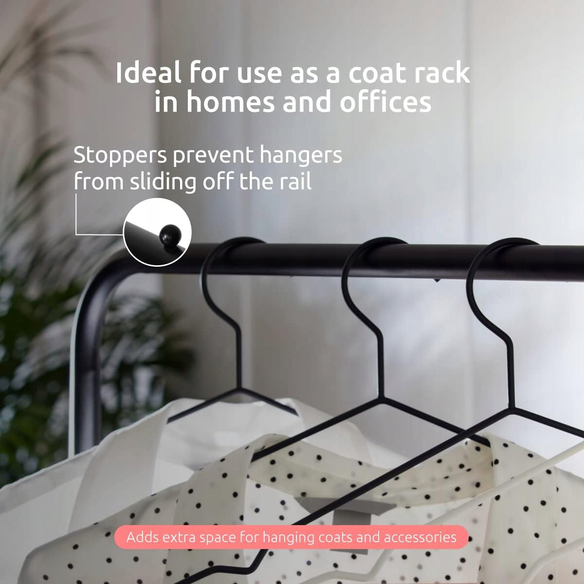 Przy wejściu służy jako garderoba na rodzinne kurtki i płaszcze. Praktyczna garderoba w sypialni pozwala na trzymanie ubrań najczęściej używanych w zasięgu ręki. W pralni lub w salonie do prasowania można powiesić świeżo wyprane lub prasowane koszule. Zatrzaski są po obu stronach, aby zapobiec ześlizgiwaniu się wieszaków. Urządzenie wykonane jest z metalowych rur w kolorze matowej czerni. Może wytrzymać do 10 kg ubrań. Wymiary 80 x 44 X H. 145 cm. Płaska dostawa ułatwiająca transport, łatwy montaż dzięki dołączonej instrukcji.