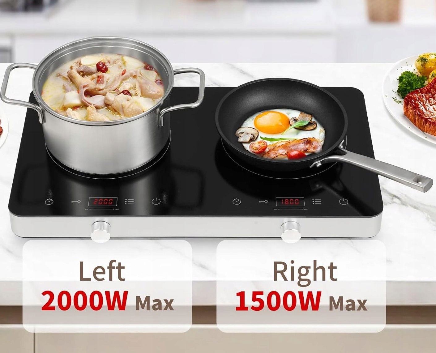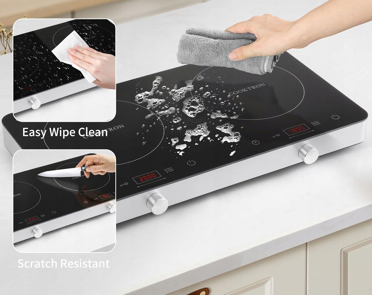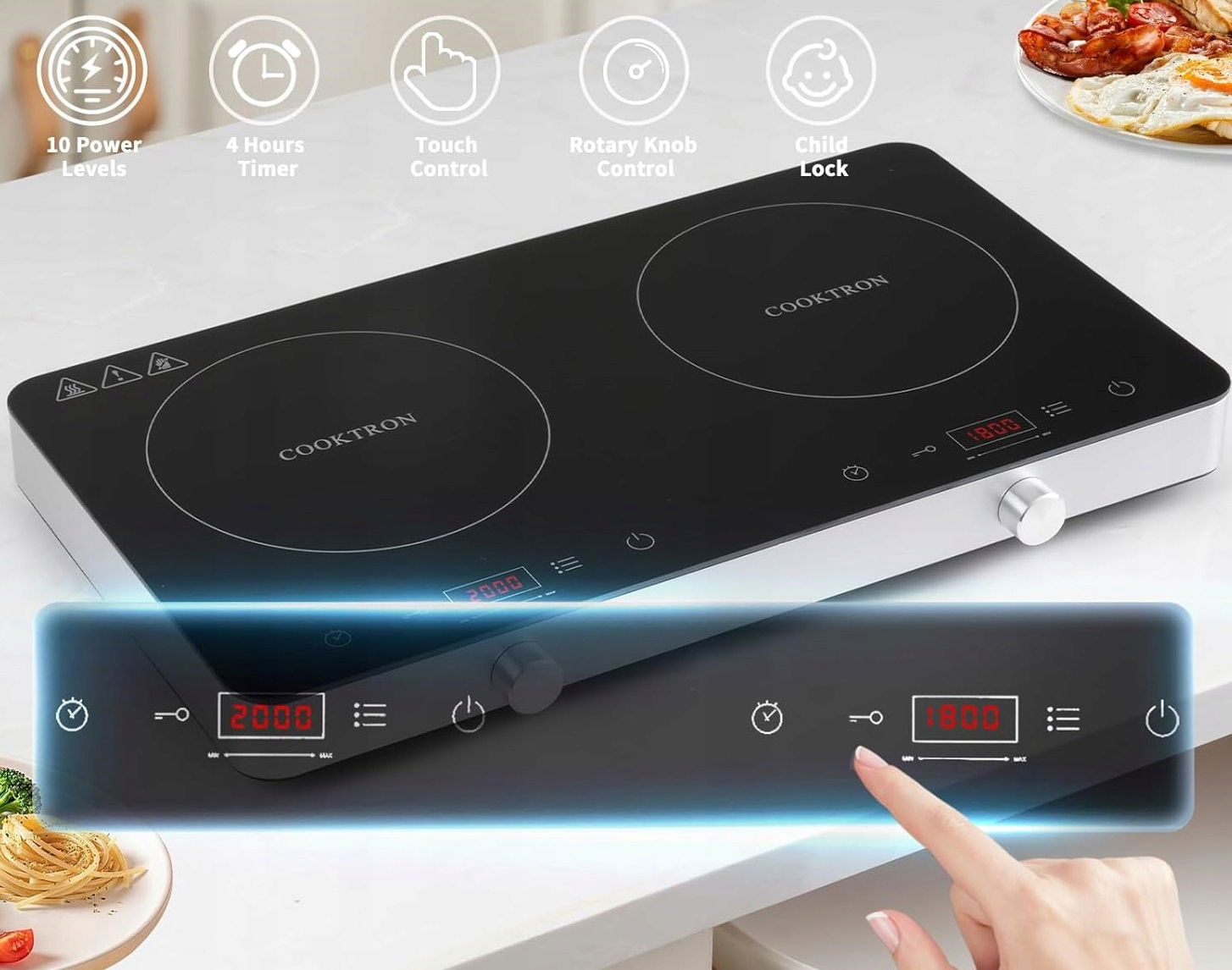 COOKTRON Płyta Indukcyjna z 2 Płytami – Podwójna Płyta Indukcyjna ze Sterowaniem Dotykowym i Przyciskiem, Niezależne Sterowanie, 10 Poziomów Temperatury, Maks. 3500 W, Timer 4-godzinny, Idealna do Domu i na Kemping ?