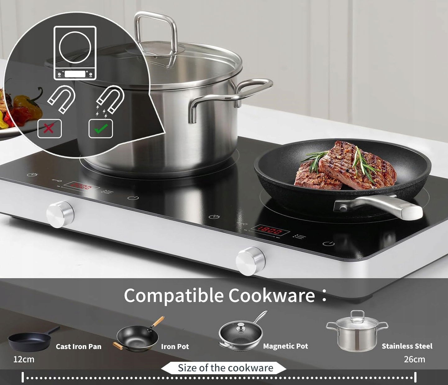 - Kompatybilność: Płyta indukcyjna jest przeznaczona do magnetycznych naczyń kuchennych (garnki i patelnie z dnem ferromagnetycznym).