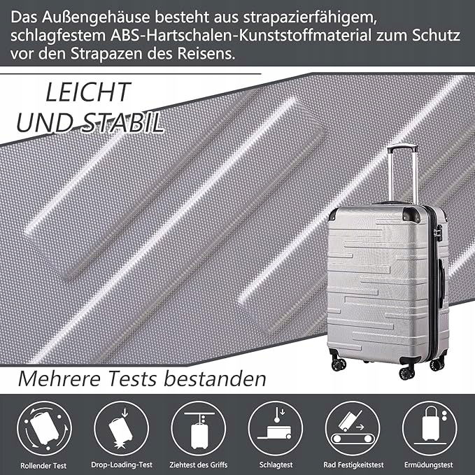 Twarda skorupa ABS + aluminiowy uchwyt do mocowania: nasze walizki są wykonane z twardego materiału ABS, są mocne, lekkie i odporne na zarysowania. Aluminiowy uchwyt teleskopowy można pchać lub ciągnąć z niewielkim wysiłkiem.