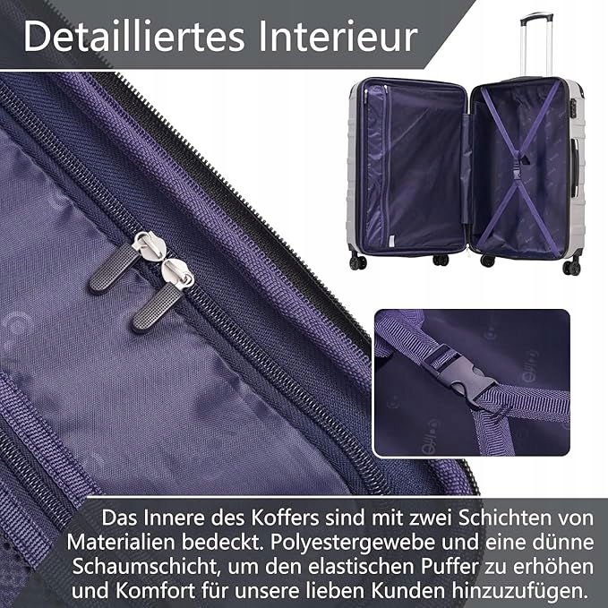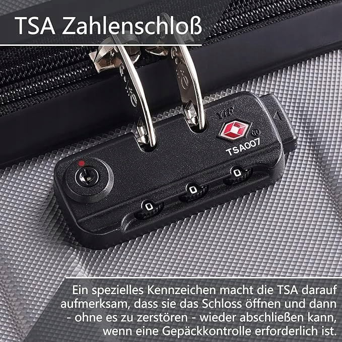 Zamek szyfrowy + 4 kółka obrotowe + uchwyt boczny: dzięki zintegrowanemu zamkowi szyfrowemu łatwo i wygodnie jest blokować i odblokowywać walizkę podczas podróży. 4 wielokierunkowe kółka obrotowe poruszają się płynnie i cicho. Uchwyt boczny może być bardzo wygodny, gdy podnosisz walizkę o dużym ciężarze.