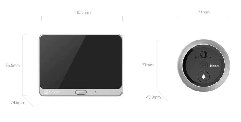 - Wymiary: Ekran i podstawa: 115,5 x 85,5 x 24,5 mm Kamera: 71 x 71 x 48.3 mm