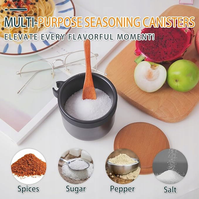 SZCZEGÓŁY DOTYCZĄCE ROZMIARU: Nasz pojemnik na cukier ma średnicę i wysokość 8 cm oraz pojemność 250 ml. Jest wystarczająco mały i kompaktowy do codziennych potrzeb związanych z konserwowaniem. Drewniana łyżka, 10 cm, jest nieco wyższa w porównaniu do pojemnika na cukier, dzięki czemu można łatwo nabierać przyprawy.