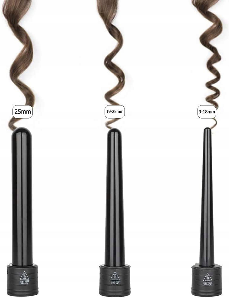 - Jeden zestaw do wszystkich stylów: Zestaw zawiera 3 wymienne końcówki ceramiczne turmalinowe, które spełniają różne style lokowania. Beczki są w różnych kształtach i rozmiarach: cylinder 25 mm, stożkowy 18-25 mm, stożkowy 9-18 mm. Zmień swoją fryzurę na gęste loki, ciesz się nieskończonymi możliwościami aranżacji w domu, zamiast w salonie fryzjerskim, oszczędzaj pieniądze i cenny czas.