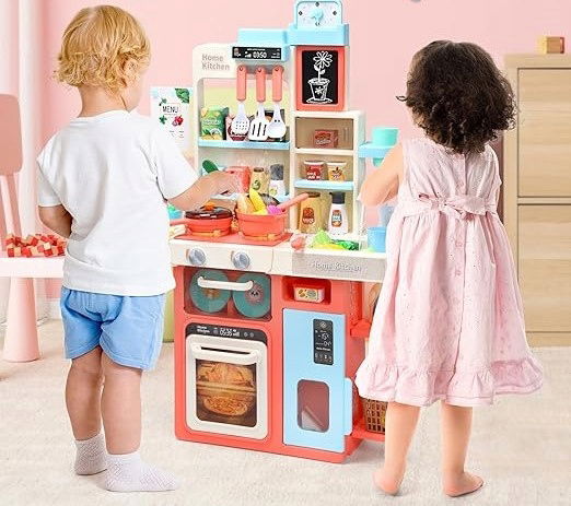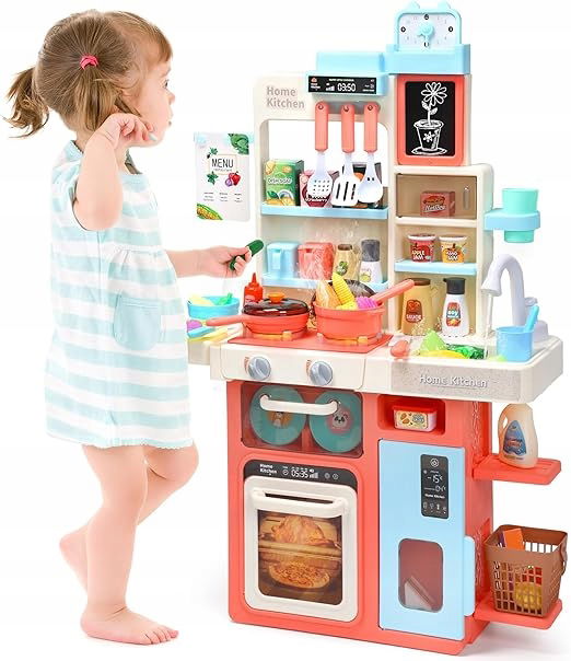 ✨ 63 akcesoria w zestawie – Wszystko, czego potrzebujesz, aby stworzyć małego mistrza kuchni: garnki, patelnie, talerze, sztućce, owoce, warzywa i wiele innych elementów do twórczej zabawy. ? Realistyczny zlew z bieżącą wodą – Nasza kuchnia jest wyposażona w w pełni funkcjonalny zlew, który naśladuje prawdziwe doświadczenie mycia naczyń i warzyw. To nie tylko zabawa, ale także nauka higieny i odpowiedzialności! ? Funkcje dźwiękowe i świetlne – Kuchnia, która ożywa! Efekty pary, dźwięki gotowania i migoczące światła pobudzą wyobraźnię i dodadzą realizmu podczas zabawy, zachęcając dzieci do odkrywania tajników kulinariów. ? Wielofunkcyjny design – Przestronny zestaw z innowacyjnymi rozwiązaniami do przechowywania: lodówka, kuchnia mikrofalowa i tablica z menu. Umożliwiają one uporządkowanie przestrzeni zabawy i pobudzają kreatywność młodego kucharza! ?️ Edukacja i rozwój poprzez zabawę – Ta kuchnia to więcej niż zabawka – to narzędzie rozwoju umiejętności motorycznych i społecznych, które pomaga dzieciom w nauce gotowania i pracy w zespole.
