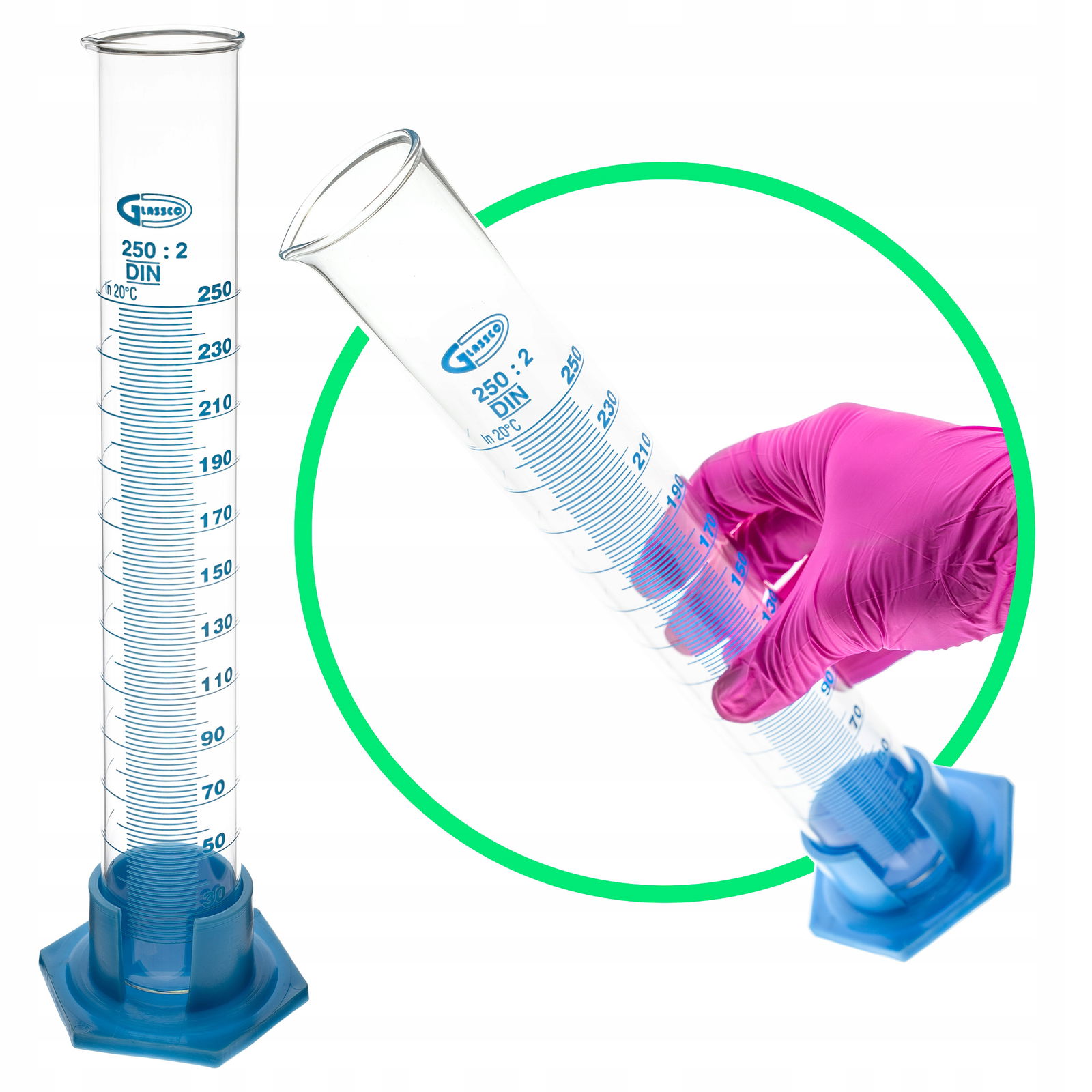Cylinder miarowy z wylewem o pojemności 250 ml, wykonany ze szkła borokrzemowego. Jest odporny na działanie gorącej wody, kwasów oraz roztworów zasadowych. Wyraźna skala o dokładności 2 ml została naniesiona kolorem niebieskim.