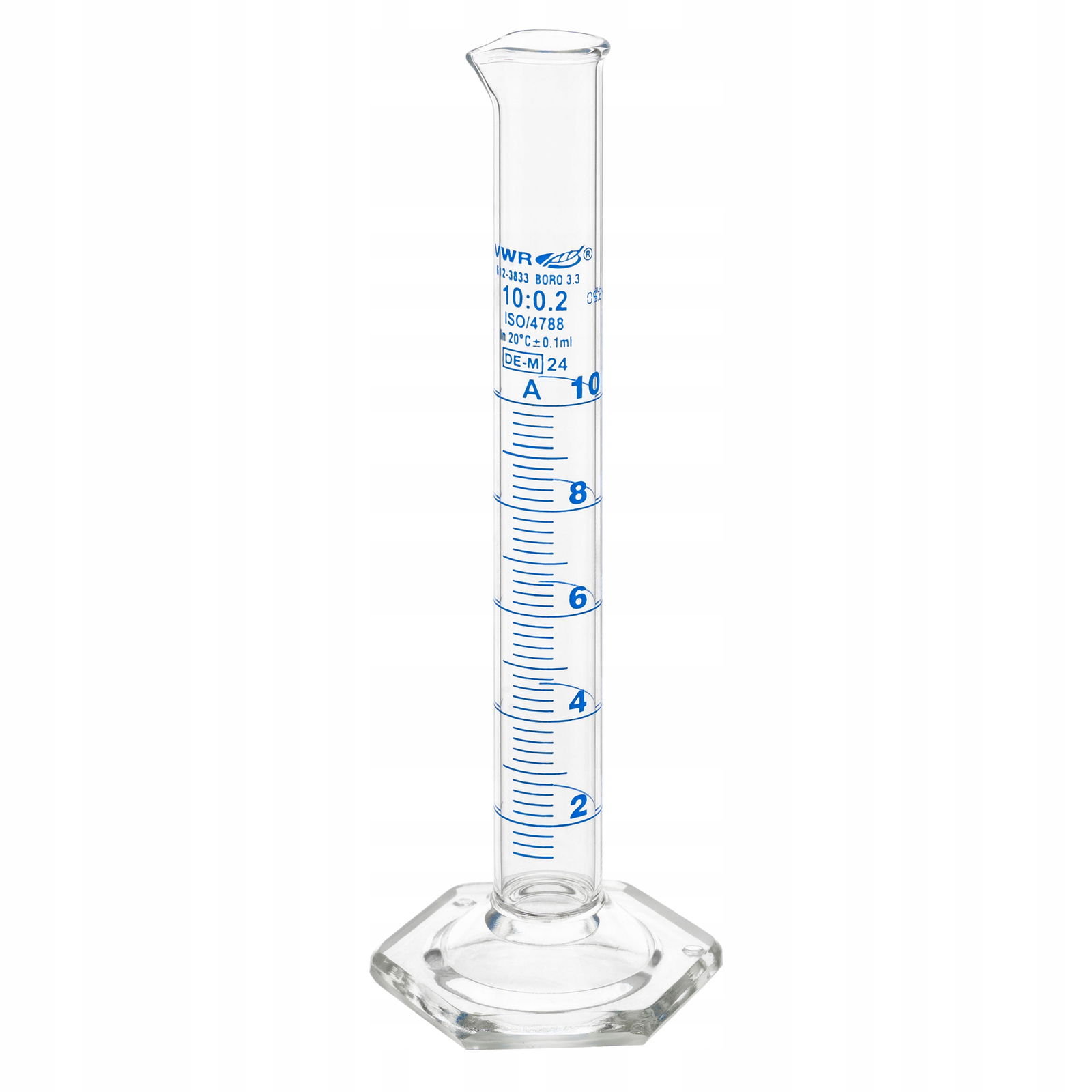 Cylinder miarowy z wylewem o pojemności 10 ml, wykonany ze szkła borokrzemowego 3.3. Jest odporny na działanie gorącej wody, kwasów oraz roztworów zasadowych. Wyraźna skala o dokładności 0,5 ml została naniesiona kolorem niebieskim. Stopka sześciokątna ze szkła zapewnia stabilną pracę.