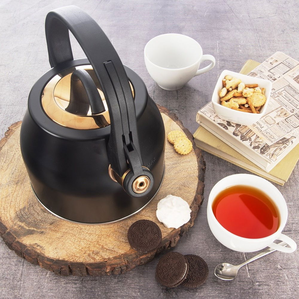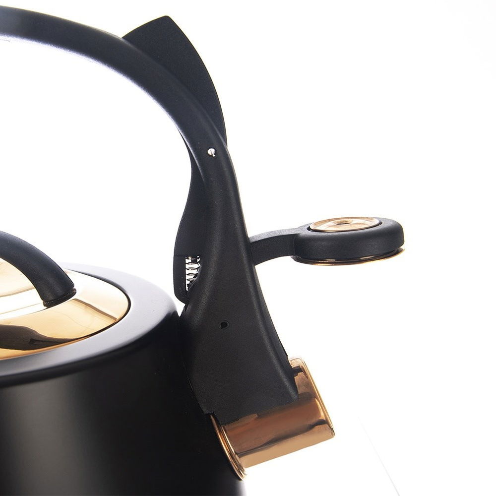 Czajnik Czarny Złoty Stalowy z Gwizdkiem do Gotowania Wody na Kuchenkę