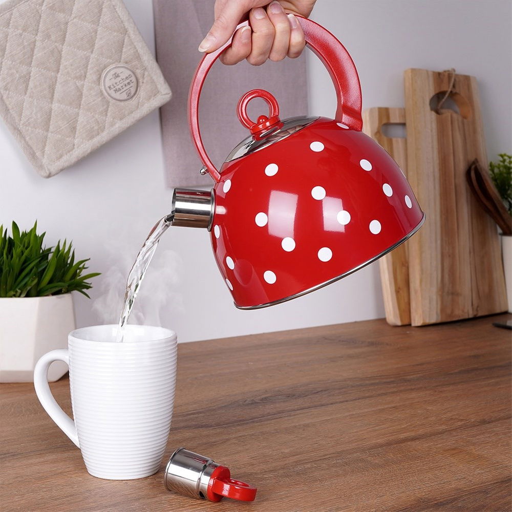 CZAJNIK CZERWONY W BIAŁE KROPKI STALOWY GWIZDEK DO GOTOWANIA WODY