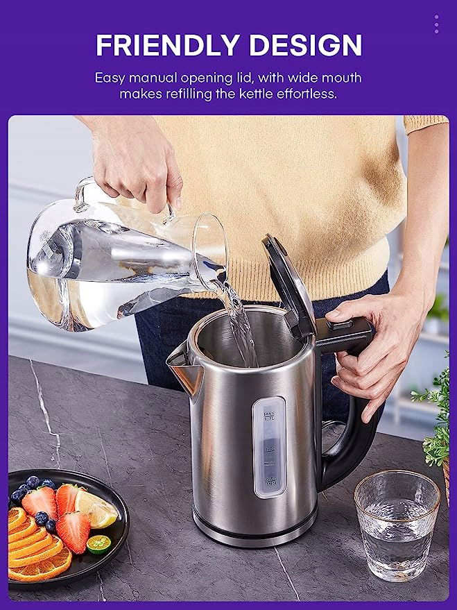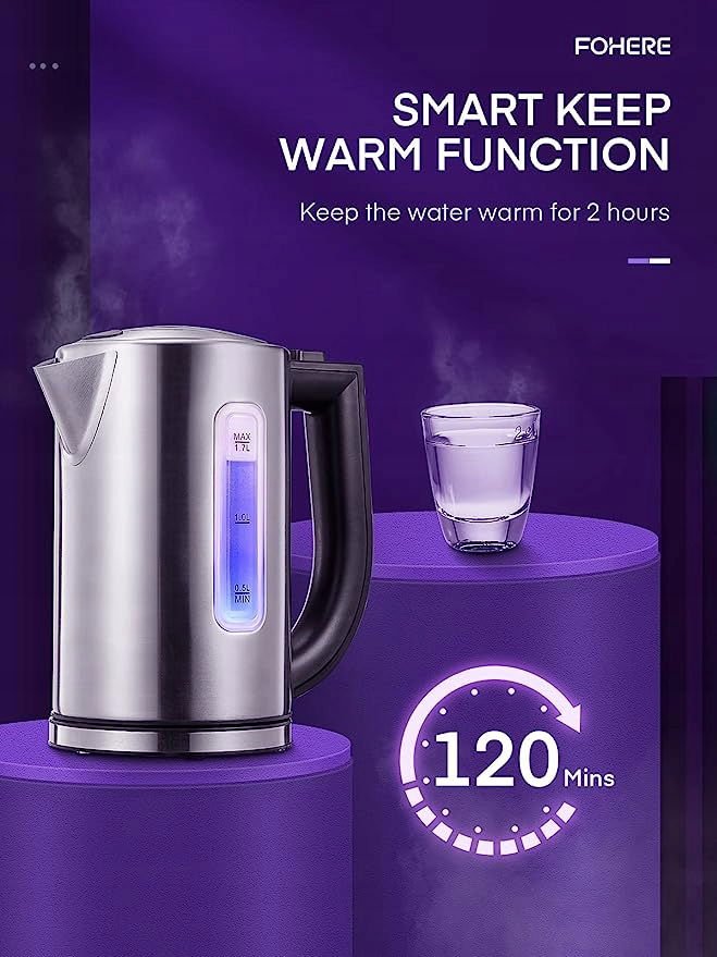 Może szybko zagotować 1,7 l wody w ciągu 5 minut. I ma 2-godzinną funkcję zachowania ciepła, wystarczy nacisnąć prawy przycisk, wybrać żądaną temperaturę, a następnie nacisnąć i przytrzymać lewy przycisk przez 3 sekundy. Ciesz się żądaną temperaturą herbaty w dowolnym momencie bez konieczności wielokrotnego gotowania.