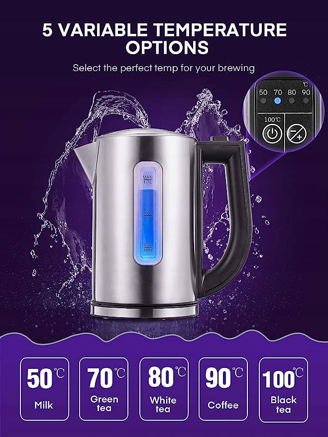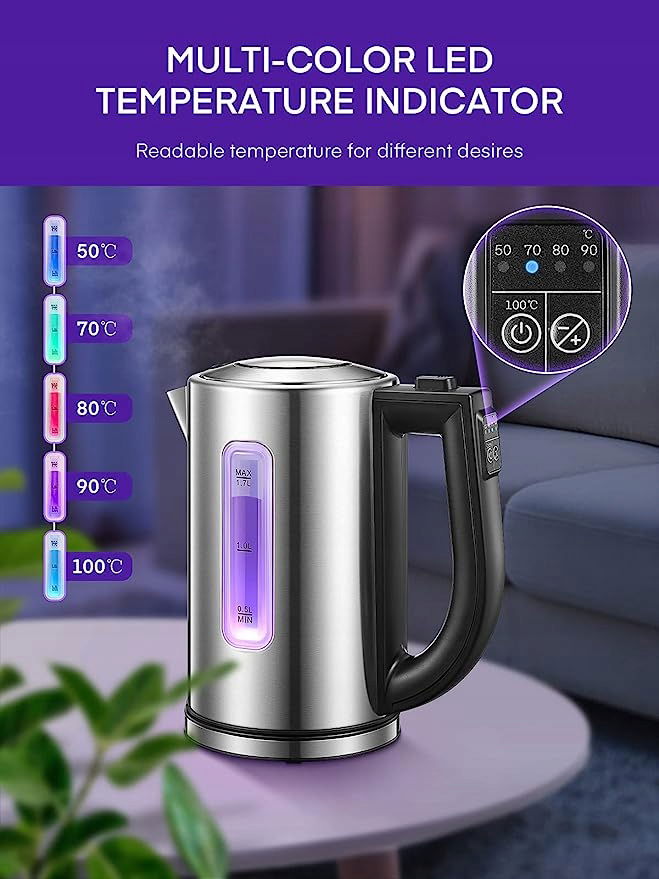 Czajnik o regulowanej temperaturze od 50 ° C do 100 ° C. Unikalne jest to, że ten czajnik ma również 5 kolorów diod LED wskazujących różne temperatury. Po prostu dostosuj temperaturę wody zgodnie z własnymi preferencjami.