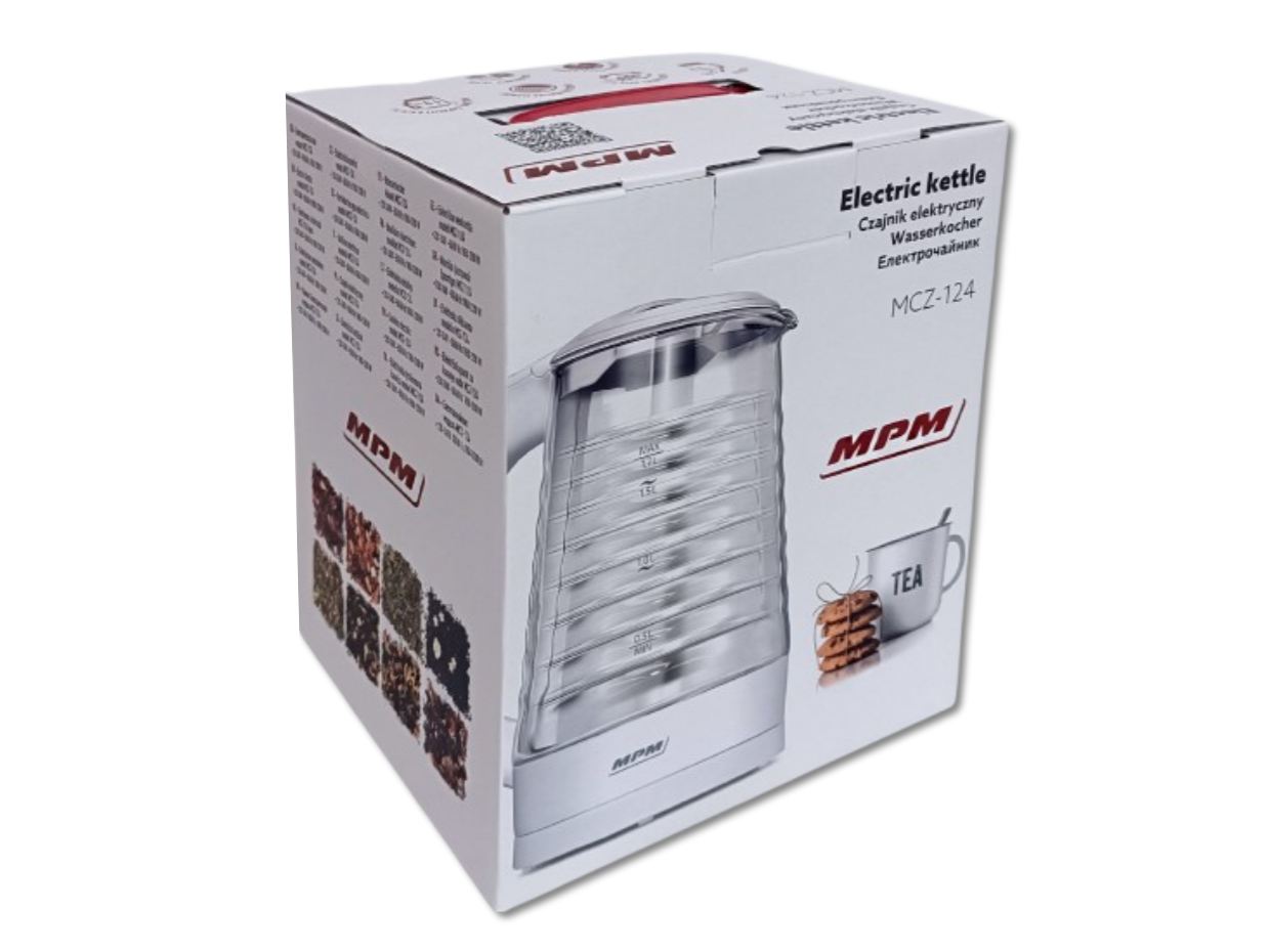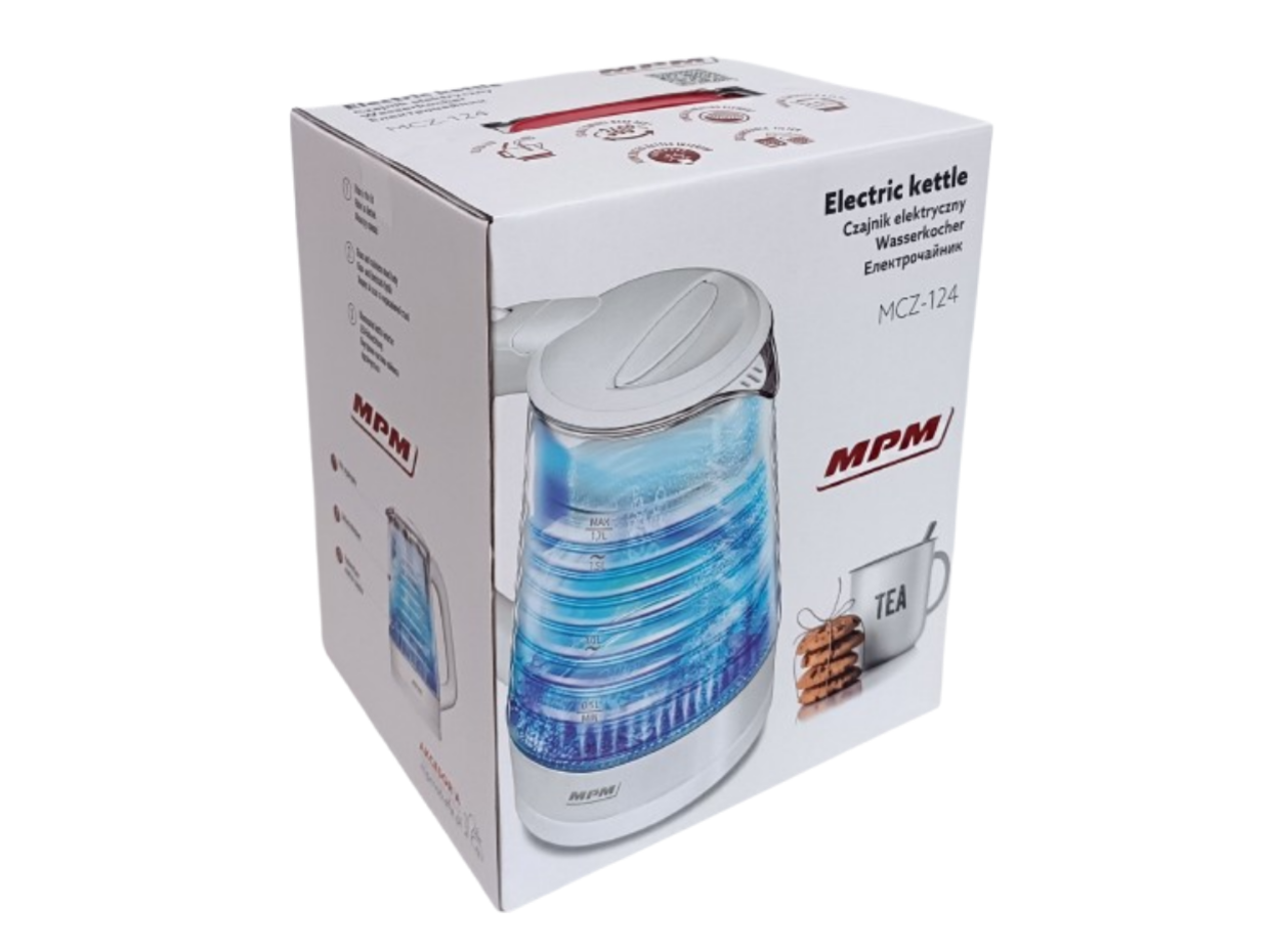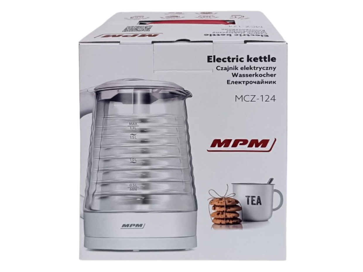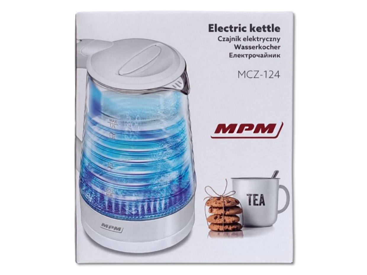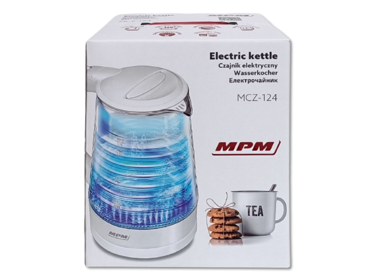 Czajnik marki MPM o pojemności 1,7l i mocy 2200W z podświetlanym wnętrzem oraz obudową wykonaną ze szkła i tworzywa sztucznego. Podświetlane wnętrze czajnika to rozwiązanie, które przyda się wszystkim zapracowanym lub roztargnionym osobom. Czajnik wyposażony jest w stabilną obrotową podstawę z antypoślizgowymi nóżkami, zakrytą grzałkę i miarkę poziomu wody (0,5l, 1,0l, 1,5l 1,7l). Produkt posiada także zamkniętą rączkę z włącznikiem w górnej części rączki, otwieraną pokrywę do napełniania czajnika, przewód zasilający o długości 70cm i miejsce na nawinięcie nadmiaru przewodu w podstawie.