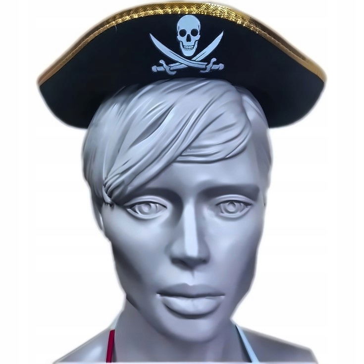 Czarno-złota czapka Pirata o obwodzie 51 cm, ozdobiona czaszką. Idealna na Halloween, bale przebierańców i tematyczne imprezy. Wykonana z trwałych materiałów, wygodna w noszeniu i efektowna w wyglądzie.