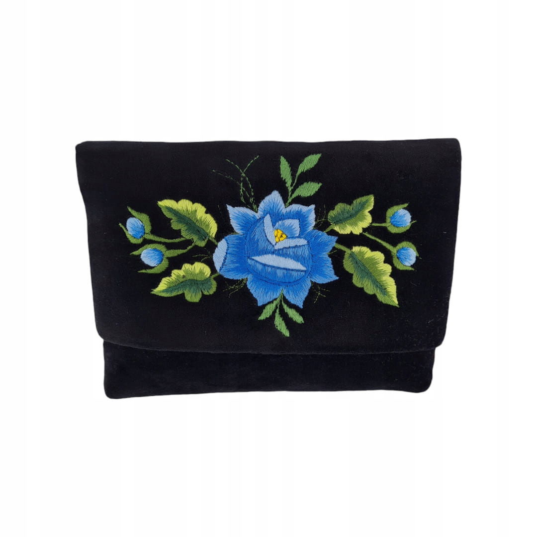 Czarna kopertówka folk - niebieska róża