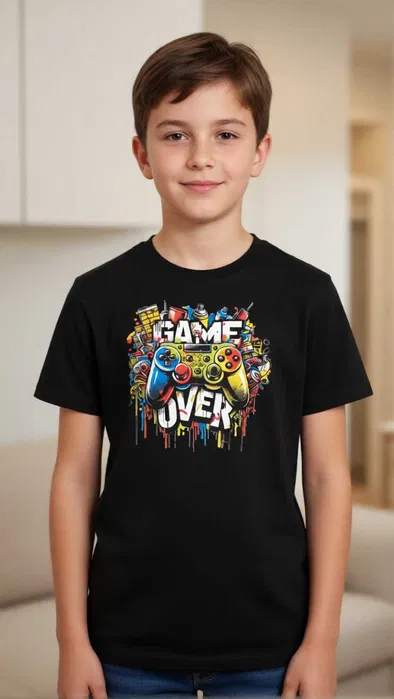 Czarna koszulka z nadrukiem Game Over dziecięca rozmiar 152. 100% bawełna