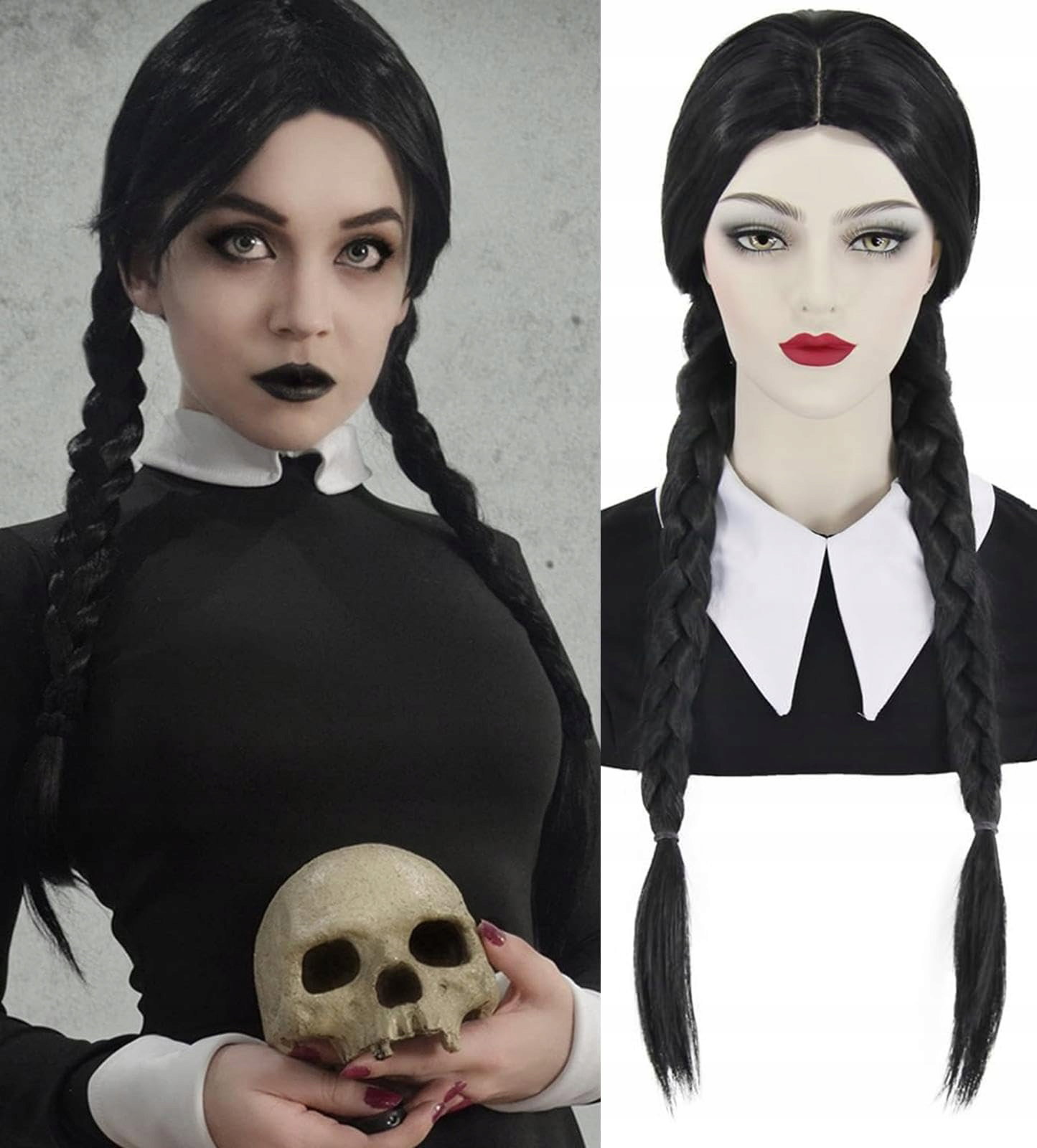 Peruka kostiumowa Addams Wednesday + 1 czepek pod perukę. Bardzo wyjątkowy design w zależności od rolki, otrzymasz wiele komplementów. Okazje: idealny na addams cosplay, imprezę, karnawał, Halloween, koncerty, wesele, randkę i inne okazje. Rozmiar czepka pod perukę wynosi ok. 52 cm - 57 cm. Regulowane paski w peruce pasują większości osób. Materiał: plecione peruki wykonane są z najlepszego importowanego włókna syntetycznego, naturalnego jak prawdziwe włosy, super miękkie i przyjazne dla skóry.