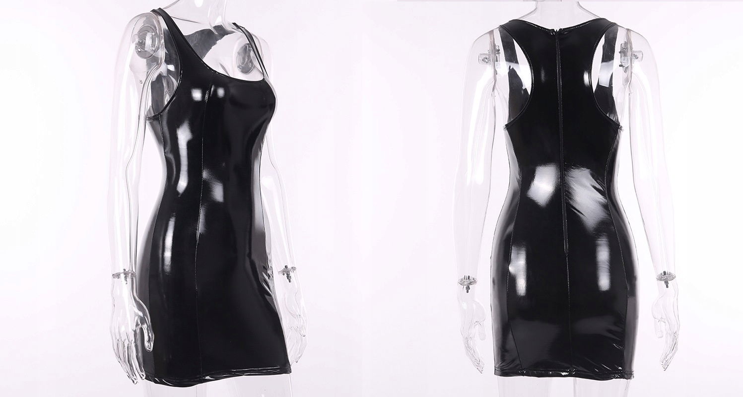 Piękna czarna vinylowasukienka damska. Idealnie układa się na ciele kobiety pokazując jej wszystkie walory. Bielizna damska, która nadaje kobiecemu ciału seksapilu. Bielizna Erotyczna, Lateks, Vinyl, Latex, WETLOOK, Lack. Jest to doskonały pomysł na prezent. Miniówka. Na pozostałych aukcjach dostępne inne kolory.