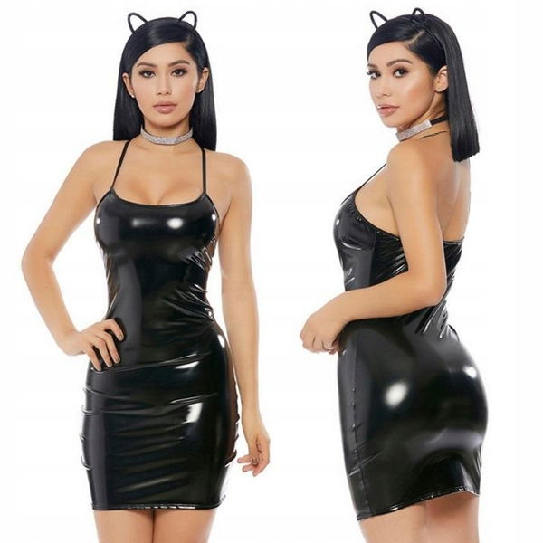 Bielizna Damska - czarna vinylowa sukienka mini + stringi. Wykonana z błyszczącego materiału. Idealnie układa się na ciele kobiety pokazując jej wszystkie walory. Bielizna damska, która nadaje kobiecemu ciału seksapilu. Seksowna bielizna dla dorosłych, Lateks, Vinyl, Latex, Lack, Wetlook.