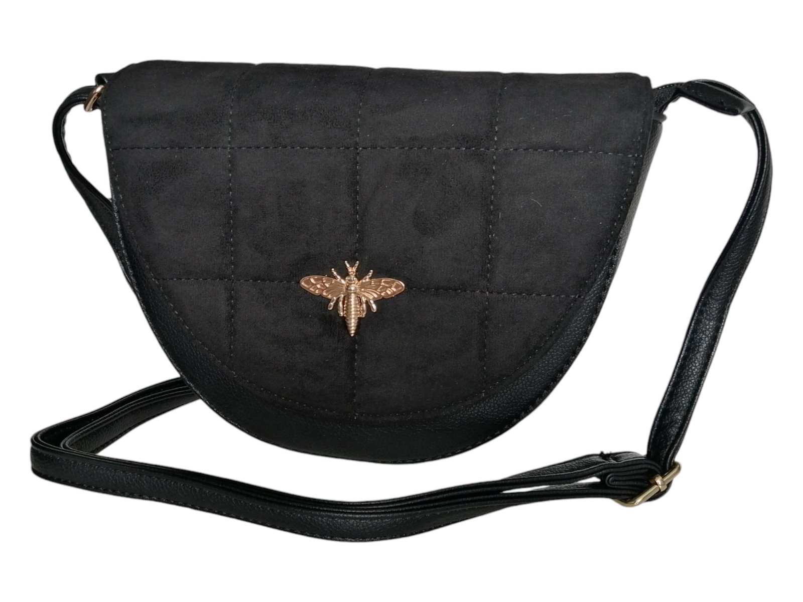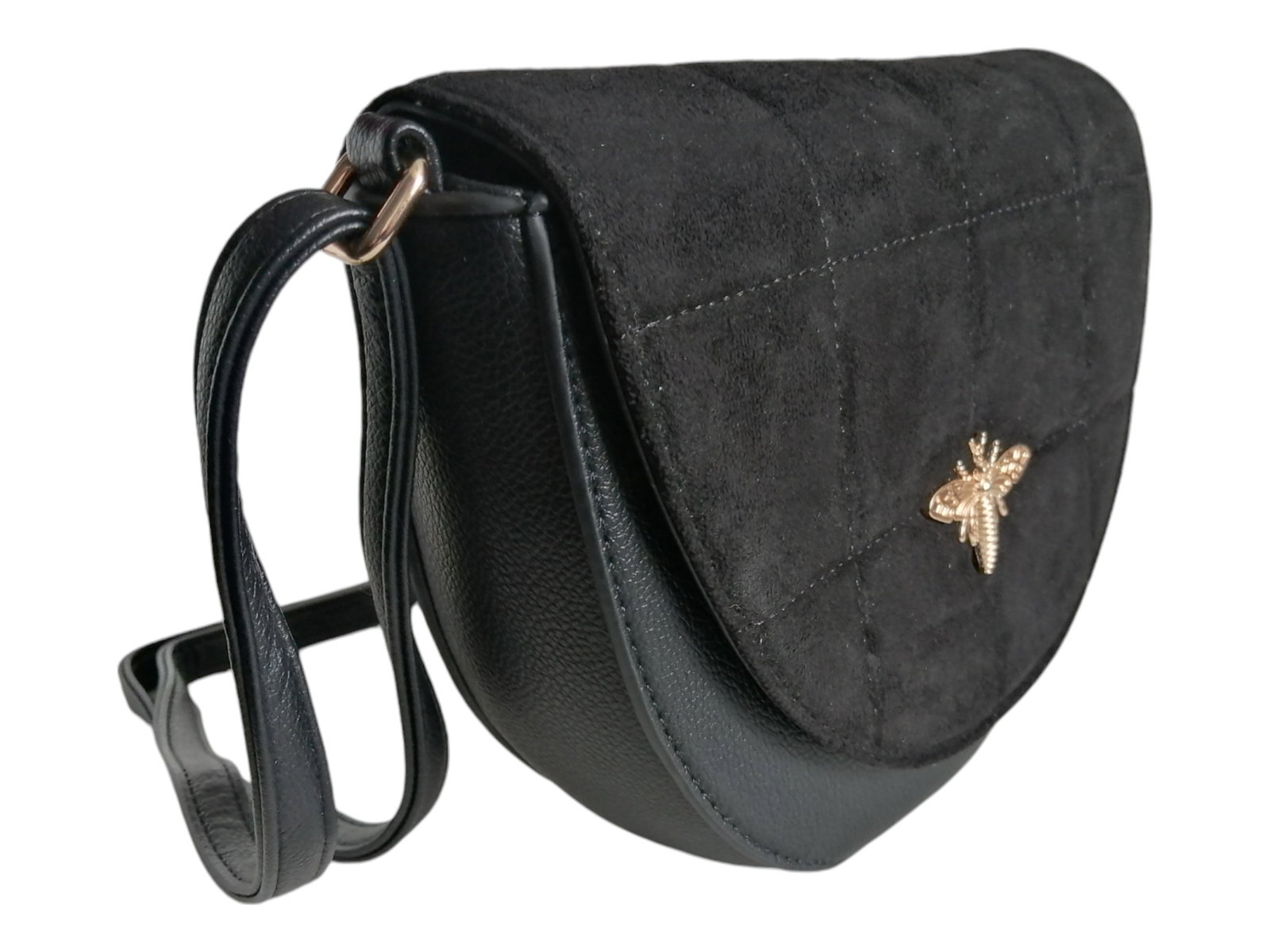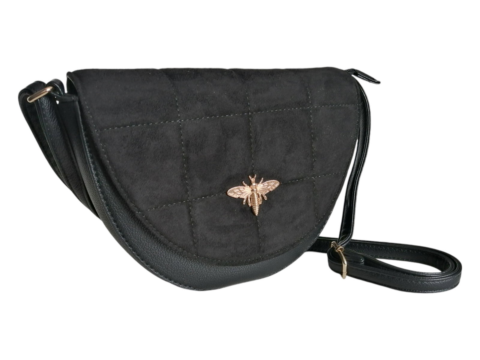 CZARNA ZAMSZOWA MAŁA TOREBKA DAMSKA Z MUCHĄ - LISTONOSZKA DAMSKA NA RAMIĘ