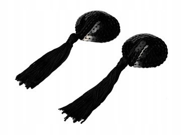 Bielizna damska - czarne nakładki na sutki w kształcie serca. Pokryte cekinami i wykończone chwostami.