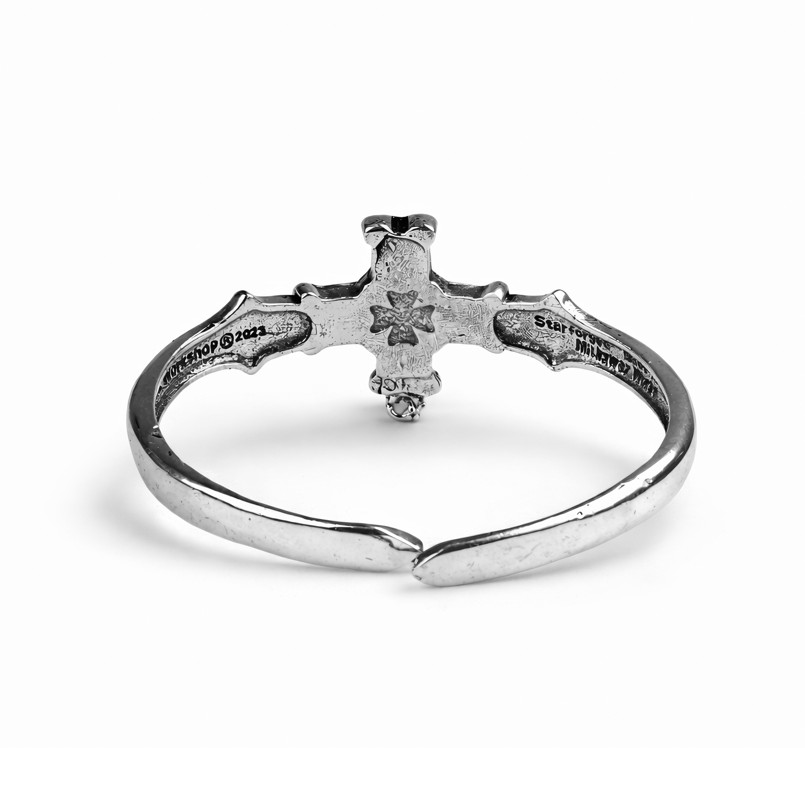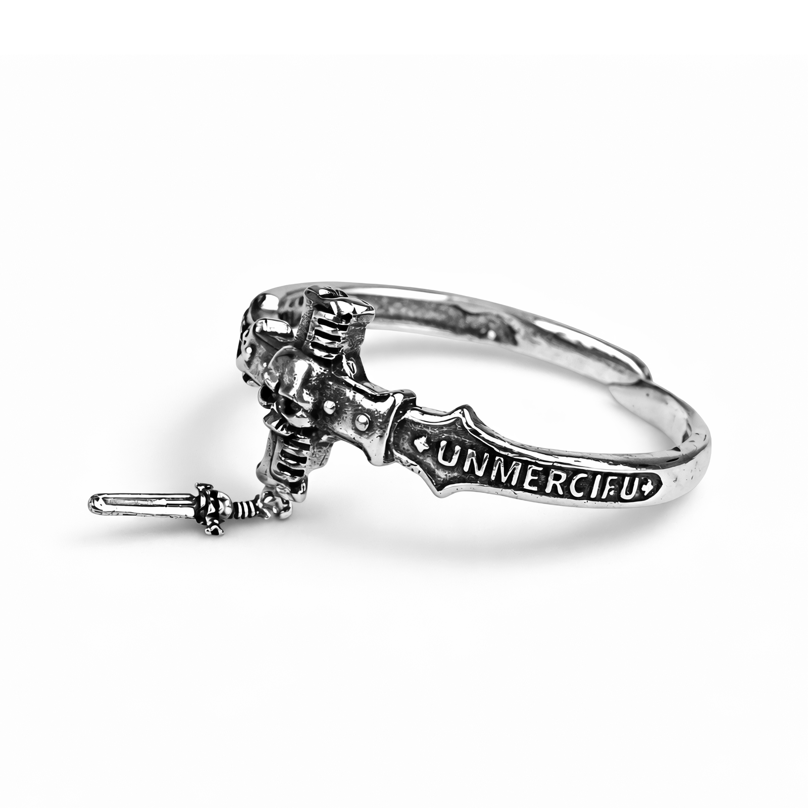 Wykuta w ponurej rzeczywistości 41. tysiąclecia, ta potężna metalowa ozdoba na nadgarstek uosabia niezachwiany duch Czarnych Templariuszy. Starannie wykonana z wytrzymałego metalu, prezentuje imponującą średnicę 8 cm i została zaprojektowana jako otwarty mankiet, zapewniający pewne, a jednocześnie łatwe zakładanie. Centralnym elementem jest surowa, naznaczona bitwami czaszka osadzona wysoko na segmentowanym, rozszerzającym się krzyżu – potężny symbol wiary, śmiertelności i jedynego celu tego rozdziału. Poniżej czaszki zwisa miecz ozdobiony emblematem przypominającym gwiazdę, symbolizującym ich nieustępliwe oddanie wojenne Imperatora. Sama opaska nosi trwałe, gotyckie napisy: „ZEMSTA” i „NIEUBŁAGANY”, wyryte głęboko jako stałe przypomnienie o podstawowych zasadach Czarnych Templariuszy. Wykończona w pragmatycznym grafitowym odcieniu, bransoleta charakteryzuje się celowo postarzaną, zużytą w boju teksturą z subtelnymi śladami narzędzi, przywołując blizny niezliczonych bitew stoczonych w imieniu Imperium. Każdy detal, od ponurego wyrazu czaszki po szorstką metalową powierzchnię, oddaje gorliwość, bezwzględność i całkowite oddanie tego rozdziału. To nie tylko ozdoba; to deklaracja niezachwianej wiary i zwiastun krwawej zemsty, która nadejdzie.