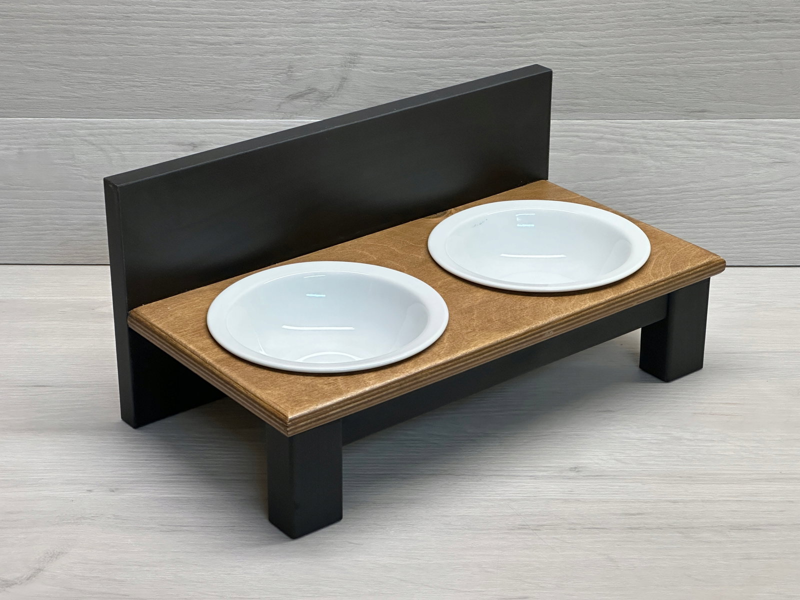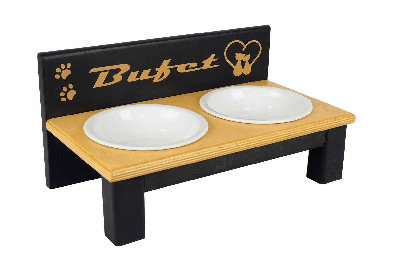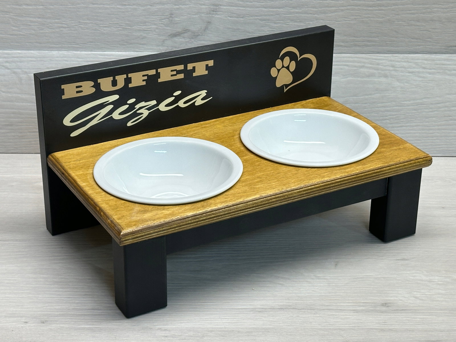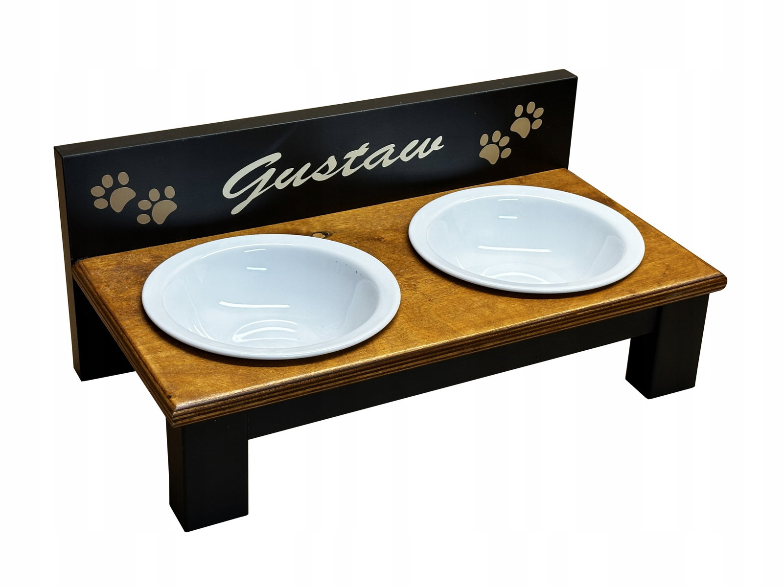 Czarny stojak z miskami ceramicznymi dla kota 2 x 14 cm. + Twój nadruk