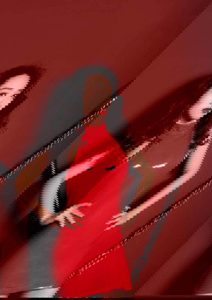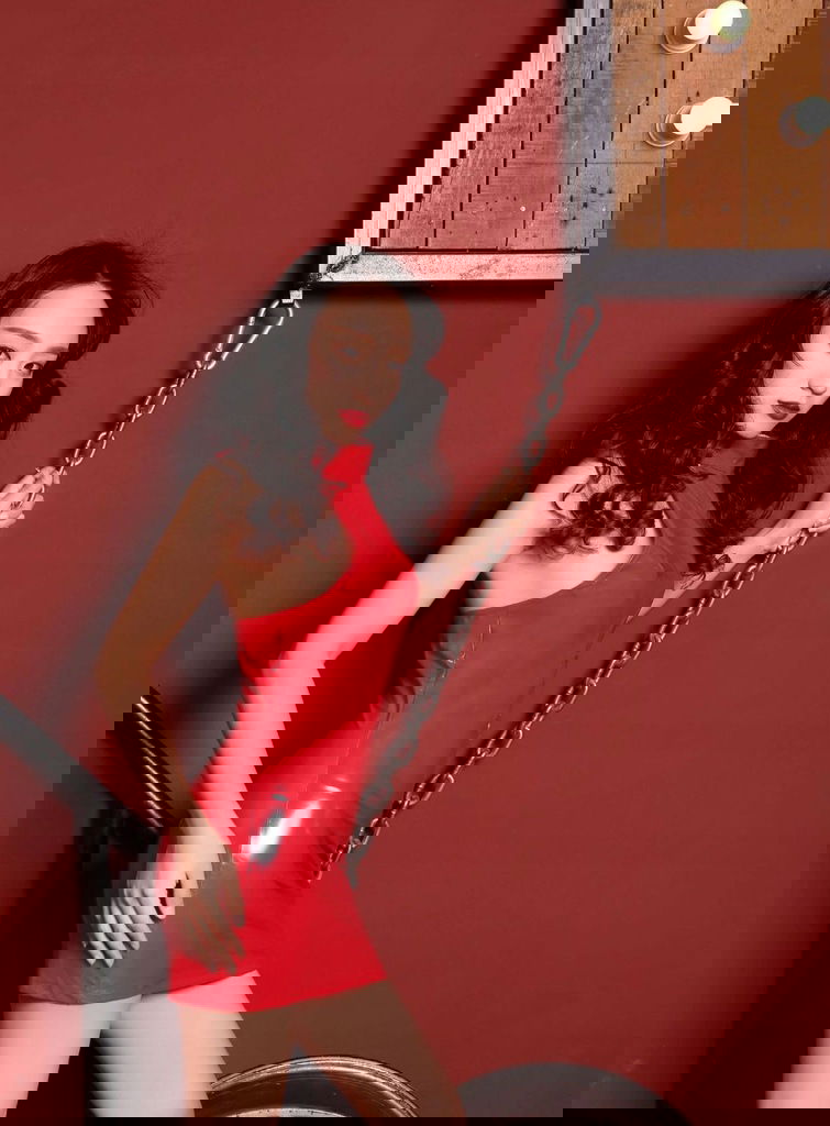 Bielizna Damska - Czerwona vinylowa sukienka mini. Wykonana z błyszczącego materiału, połysk. Idealnie układa się na ciele kobiety pokazując jej wszystkie walory. Bielizna damska, która nadaje kobiecemu ciału seksapilu. Seksowna bielizna dla dorosłych, Lateks, Vinyl, Latex, Lack, Wetlook.